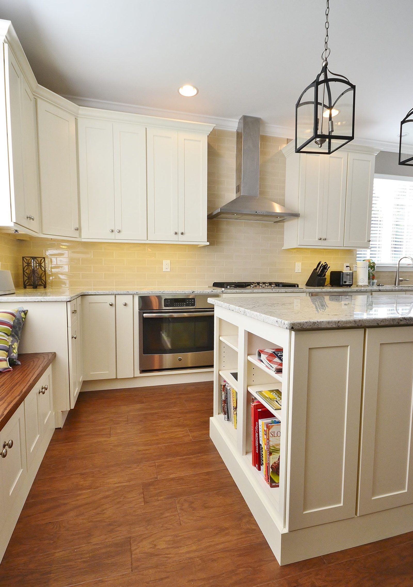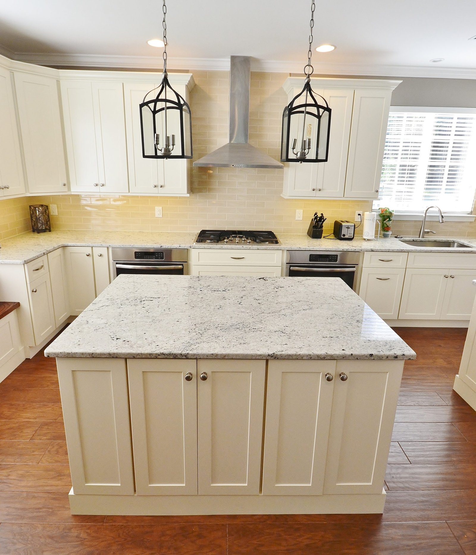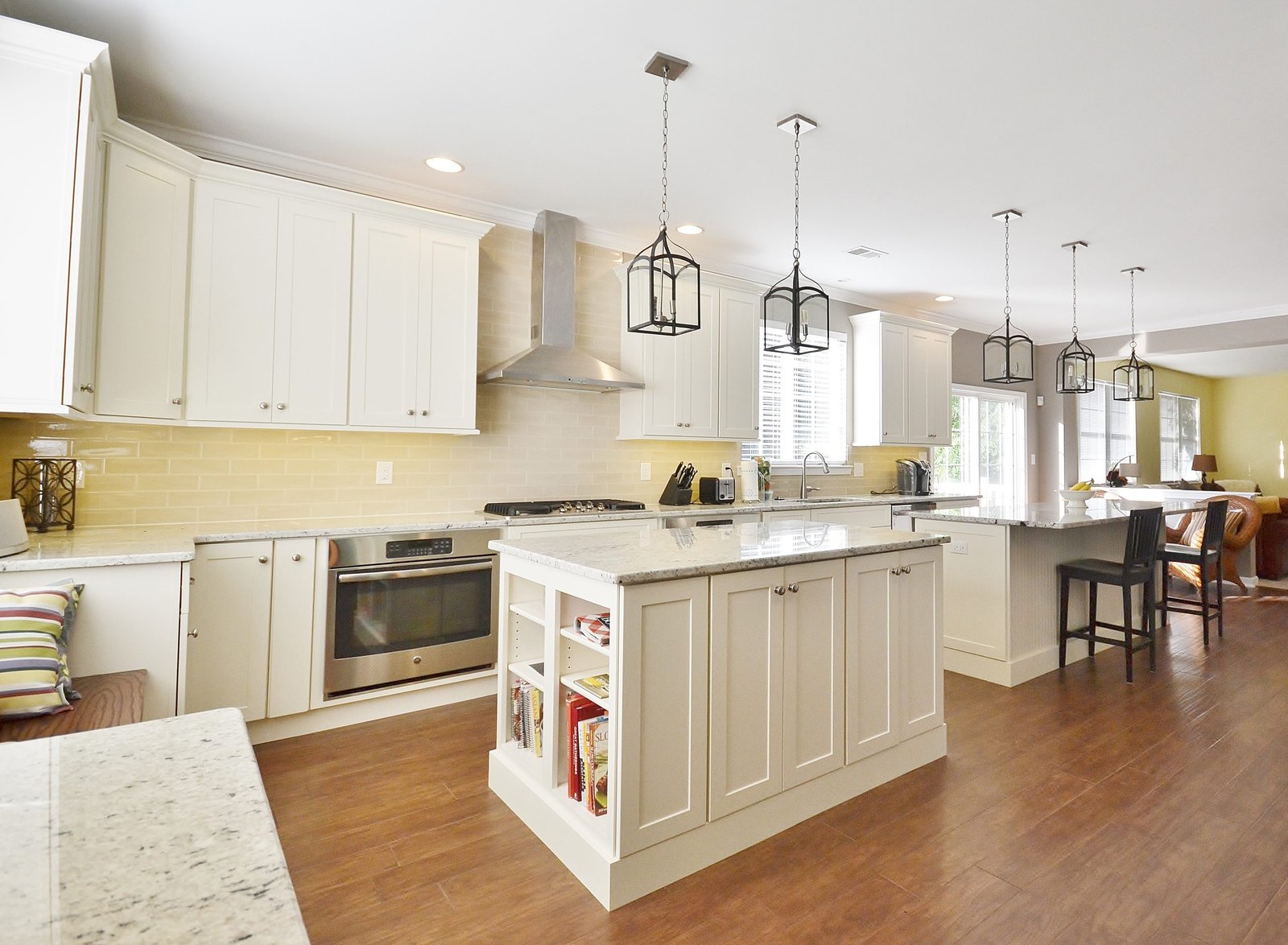 This kitchen remodel strikes the ideal balance between elegance and comfort. The expansive layout features white shaker cabinetry, granite countertops, and a large central island that doubles as a prep space and casual dining area. Warm wood floors ground the bright palette, while a built-in bench with storage adds charm and practicality. Modern pendant lights, stainless steel appliances, and a sleek range hood complete the look, creating a space that is both functional for daily living and beautiful for entertaining.