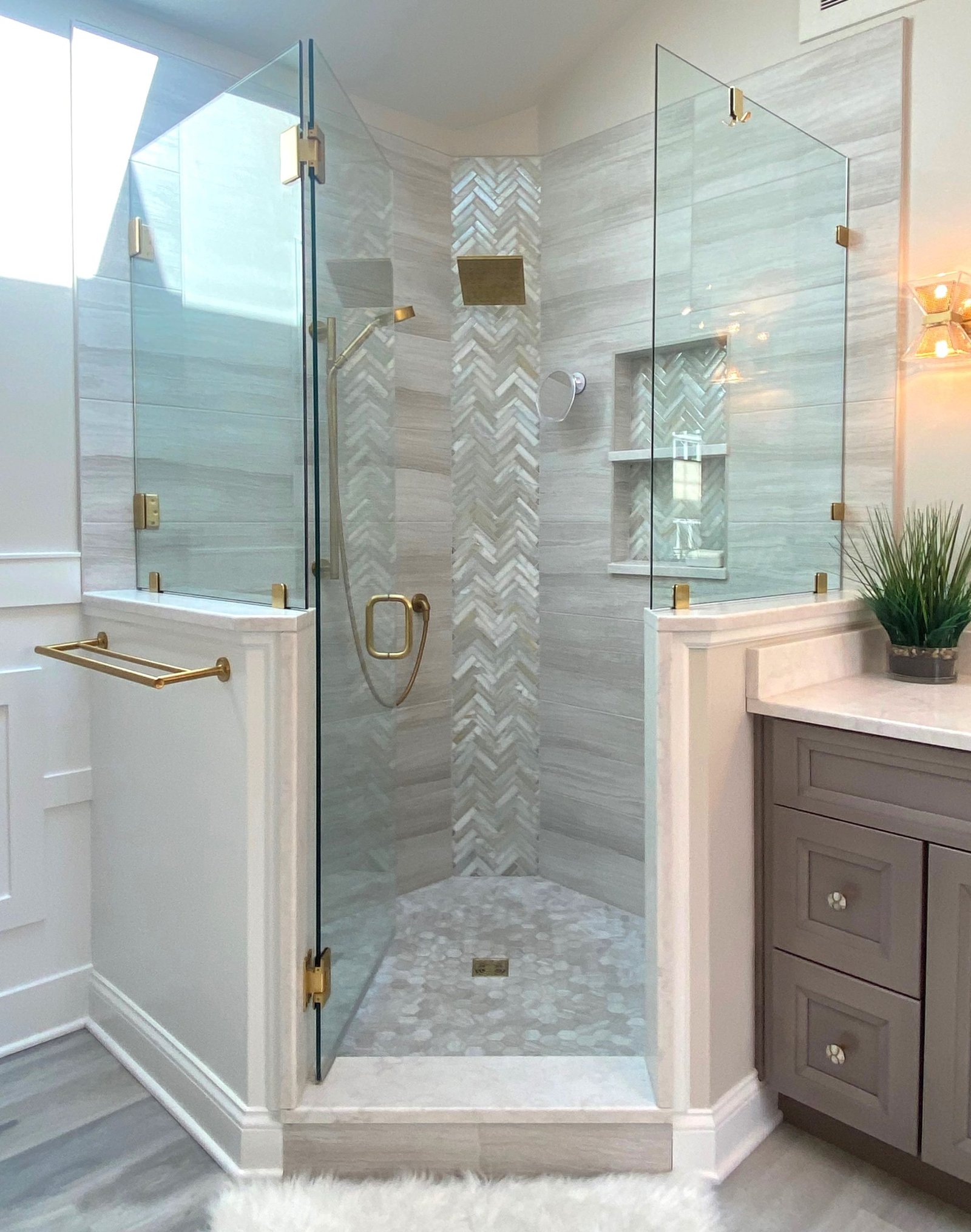 The centerpiece of the bathroom is the freestanding soaking tub, positioned against a custom white paneled wall that adds depth and architectural interest. Above, floating wood shelves provide a warm, natural touch while displaying curated décor. Just steps away, a frameless glass shower with floor-to-ceiling tile creates a spa-like experience. The herringbone accent wall inside the shower adds texture and visual intrigue, while a built-in bench and recessed shelving enhance both functionality and style.