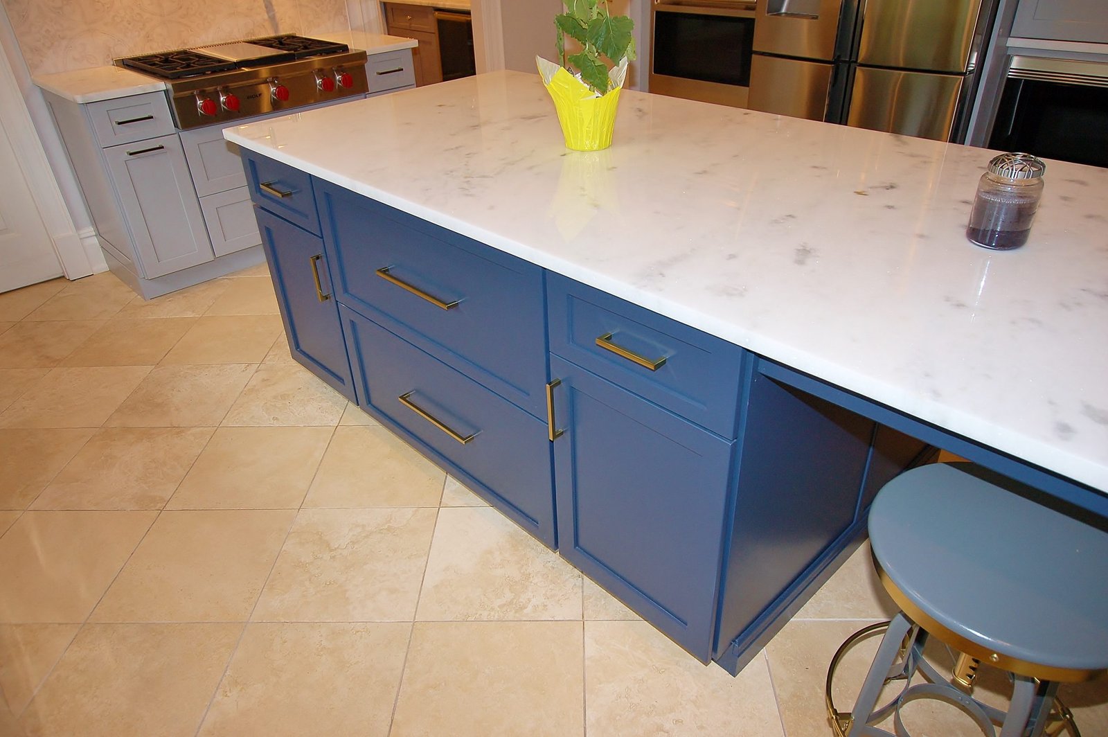Cabinetry with Navy Island and Marble Accents
