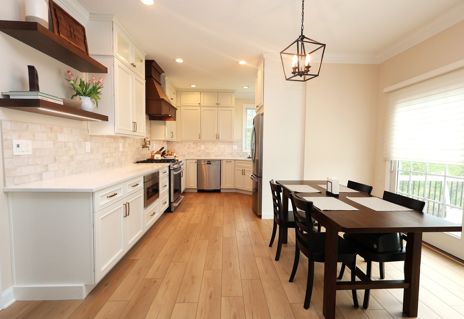 This Chester County, PA kitchen remodel showcases a perfect balance of bright, modern design and warm, natural accents. Custom white cabinetry extends to the ceiling, offering ample storage and a clean, timeless look. The centerpiece is a rich walnut-stained custom range hood, paired with matching floating shelves that add warmth and character. Elegant quartz countertops provide a durable and beautiful workspace, complemented by a soft-toned tile backsplash for subtle texture. Thoughtful details, including under-cabinet lighting and brass hardware, complete the look. Designed for both functionality and style, this kitchen delivers a welcoming space ideal for cooking, dining, and entertaining.