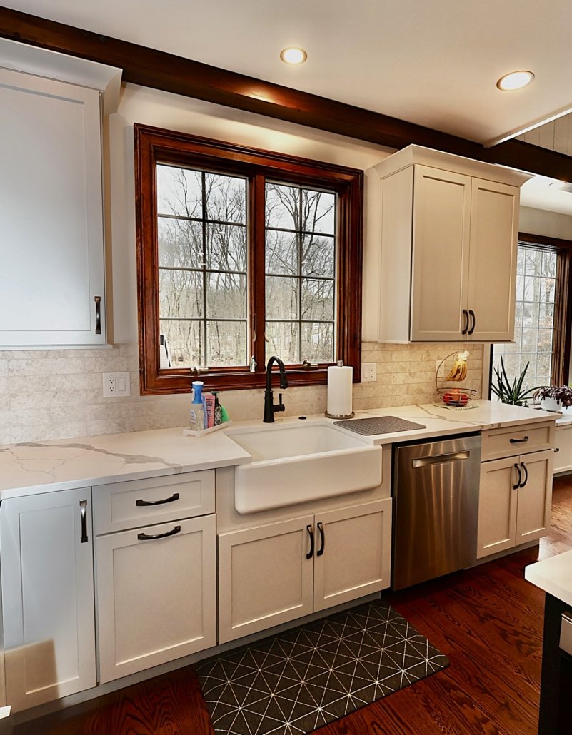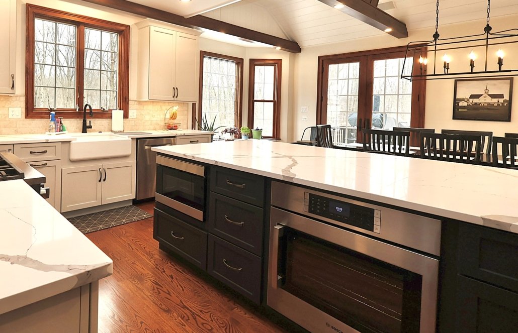 This impressive sized kitchen was remodeled from Tuscan to modern chester county farmhouse, resulting in a space that earns its spot as one of our most dramatic transformations.