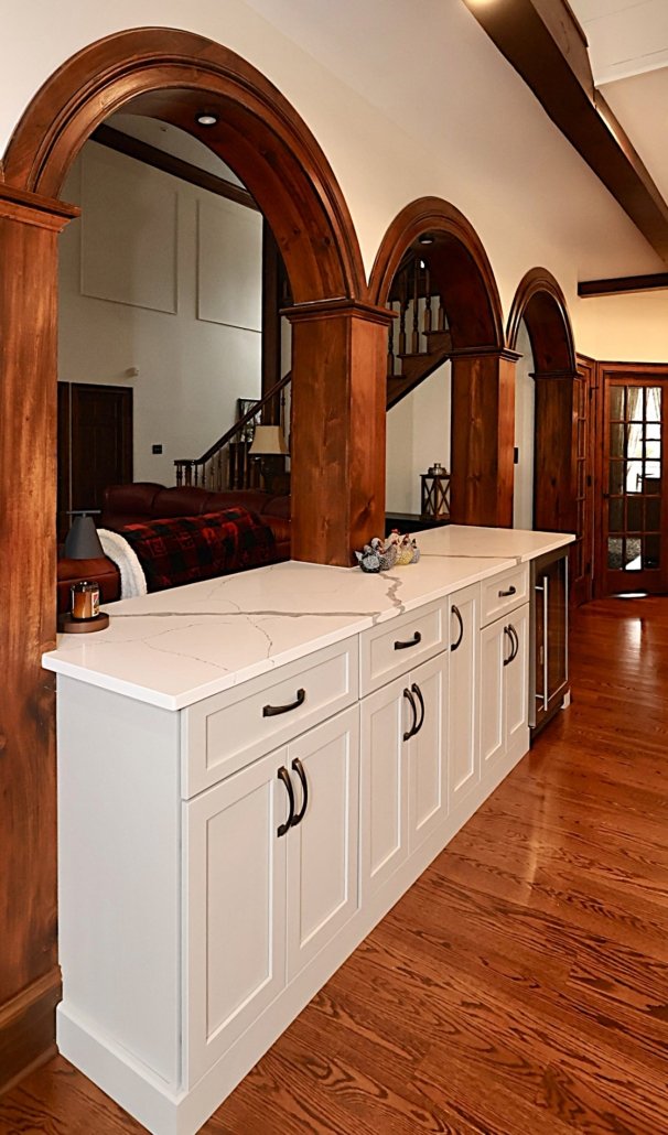 There is a huge prep island made of quartz as well as added counter space and cabinetry at the arched wall between the informal dining area and family room.