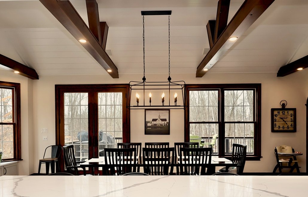 The beams along with the nickel gap installation to the vaulted ceiling are a beautiful architectural design element and are reminiscent of the original woodwork.