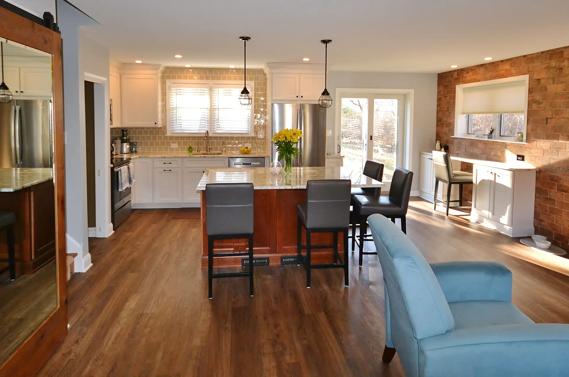 This beautifully remodeled kitchen balances warmth and sophistication with a seamless open-concept layout. The focal point is a large granite island paired with rich wood cabinetry, offering ample prep space and casual seating. Crisp white cabinets and sleek stainless-steel appliances create a clean, timeless look, while the textured brick accent wall adds a touch of rustic charm and warmth to the space. Natural light floods in through expansive windows and sliding glass doors, connecting the kitchen to the outdoors. The adjacent cozy seating area with plush chairs makes this kitchen equally perfect for entertaining and everyday living.