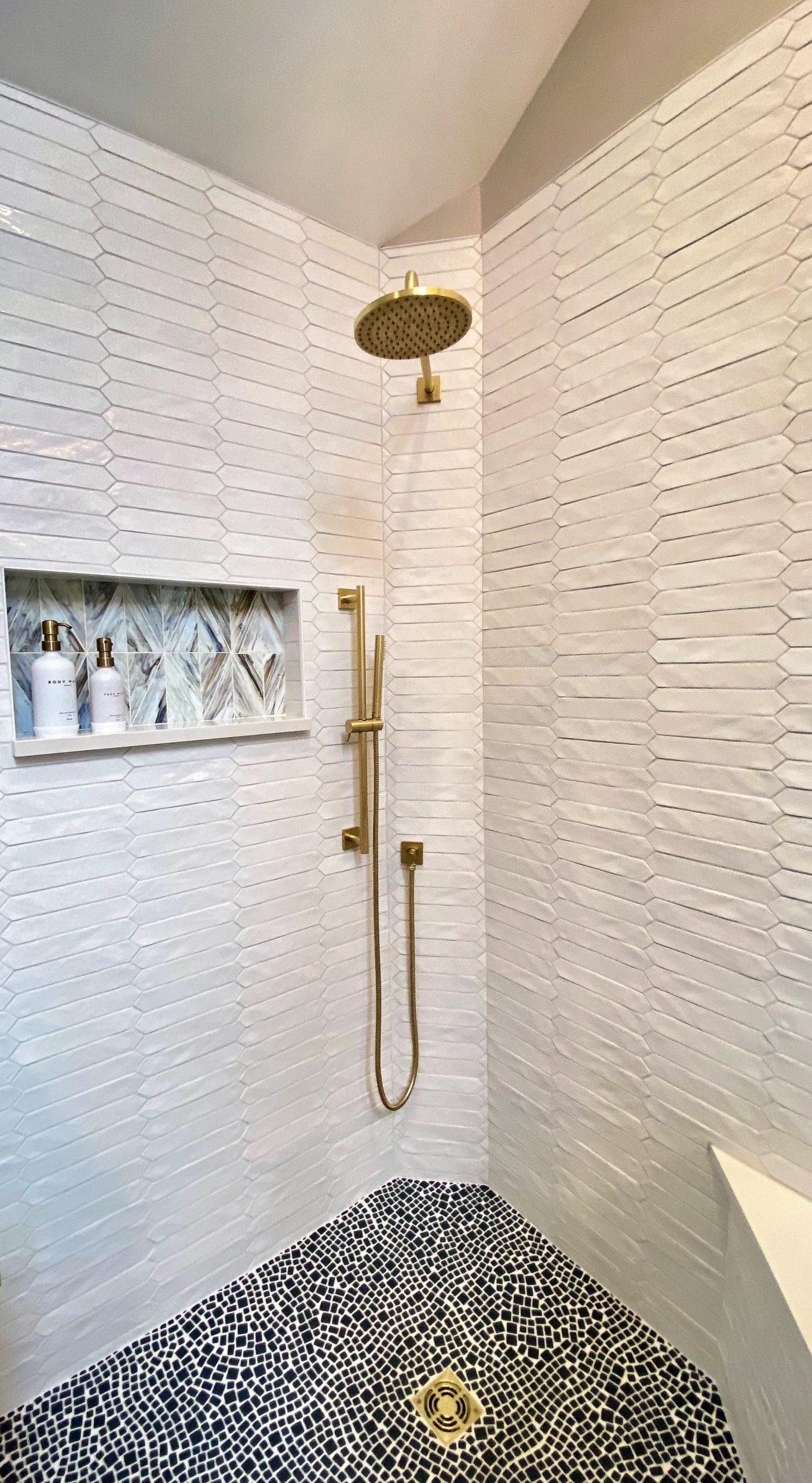 A freestanding soaking tub sits by the window, paired with a sleek gold tub filler that adds both function and style. Floating wood shelves provide space for décor while keeping the design light and natural. The large glass shower features striking white textured tile walls, a mosaic stone floor, and recessed niches with accent tile for added detail. A built-in bench enhances functionality, while gold fixtures bring elegance throughout.