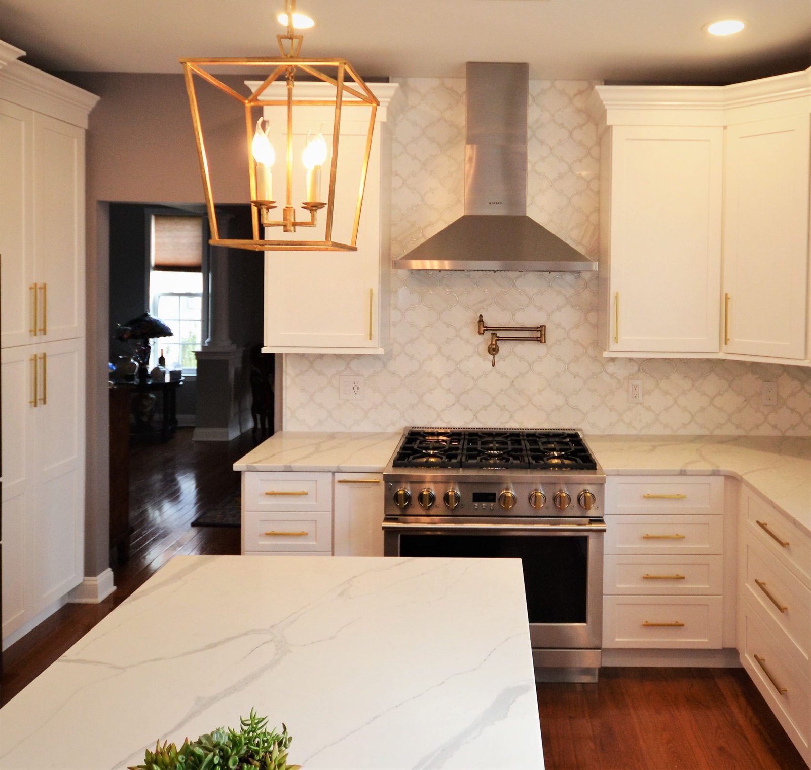 This stunning kitchen renovation showcases the perfect balance of bold and timeless design. Crisp white cabinets provide a clean backdrop, while the deep navy island adds dramatic contrast. Luxurious gold hardware and statement pendant lights elevate the space with a touch of glamour. The waterfall-edge quartz countertops create a seamless, high-end finish, complemented by an elegant patterned backsplash. Every detail—from the pot filler above the range to the built-in appliances—was chosen to combine functionality with beauty, resulting in a space that’s both stylish and inviting.