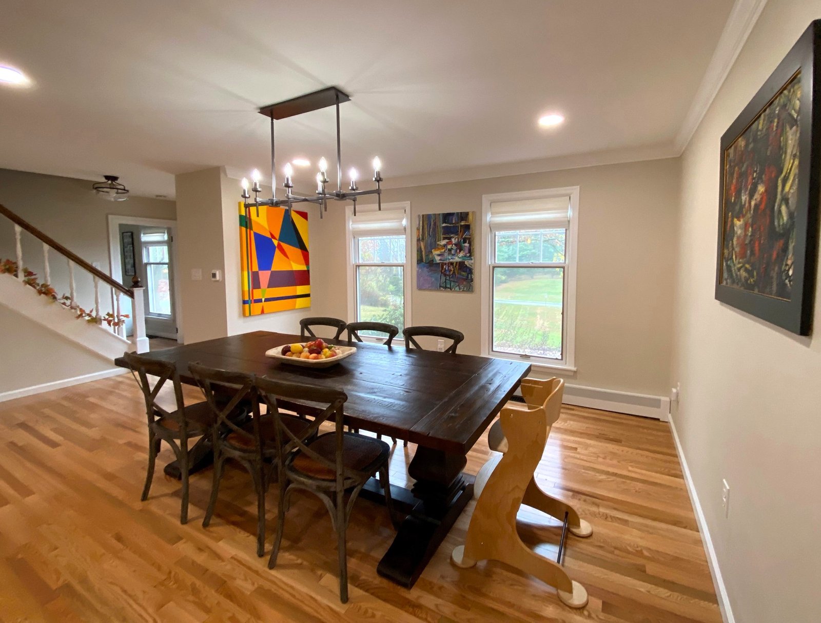 Lighting & Ambiance: Energy-efficient recessed lighting pairs with modern glass pendant lights to create a bright, inviting atmosphere.