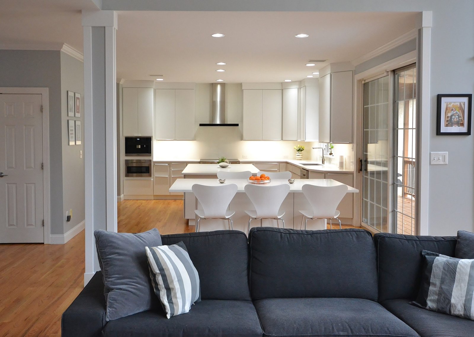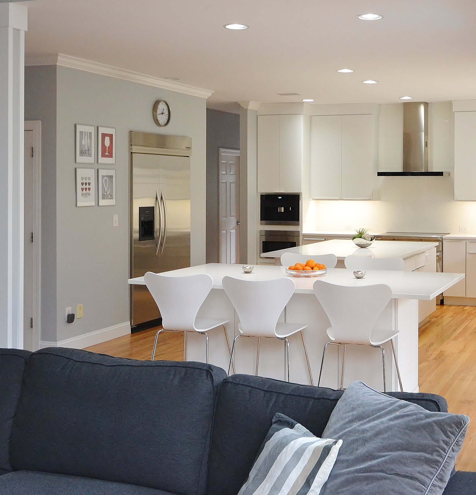 This kitchen is the heart of modern living — clean lines, bright white cabinetry, and seamless quartz countertops create a sleek, contemporary look. The oversized island with a waterfall edge offers plenty of prep space while doubling as a casual dining spot with seating for family or guests. Natural light pours in through large windows and glass doors, reflecting off stainless-steel appliances and warm hardwood floors to give the space a bright, inviting feel. It’s a perfect blend of style and functionality, designed for both everyday cooking and entertaining.