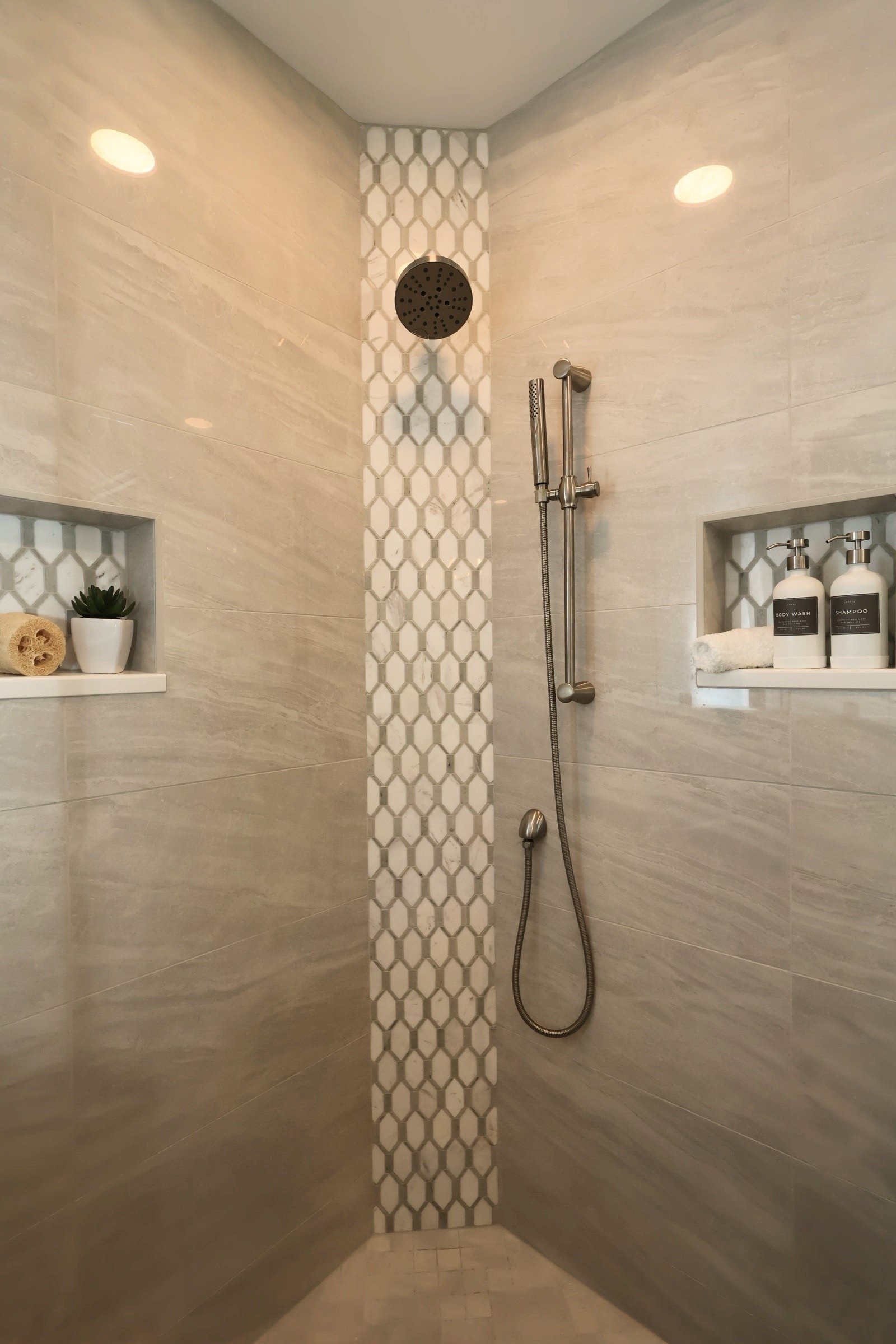 This Chester County, PA bathroom transformation embraces a contemporary yet inviting feel. The custom dark-stained double vanity features clean lines, soft-close storage, and a bright quartz top for contrast. The frameless glass shower is accented with bold geometric tile inlay, creating a striking vertical feature while maintaining an airy, open look. Thoughtful lighting and a neutral palette tie the room together, making it a calm, functional retreat.