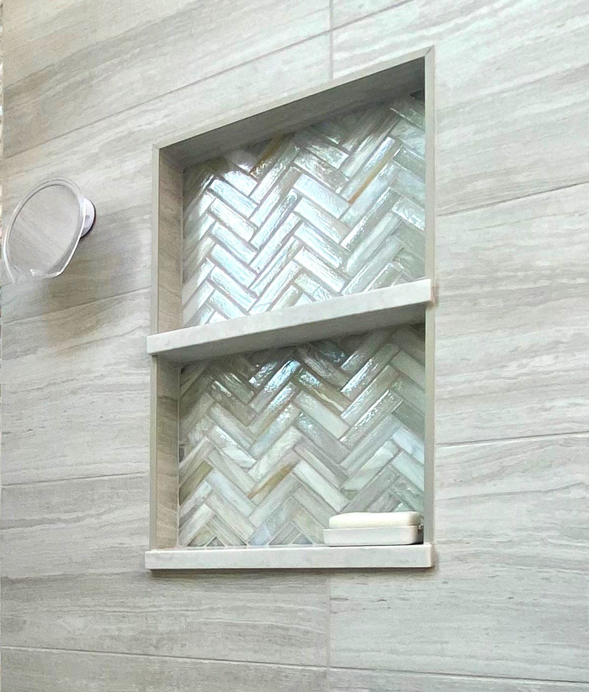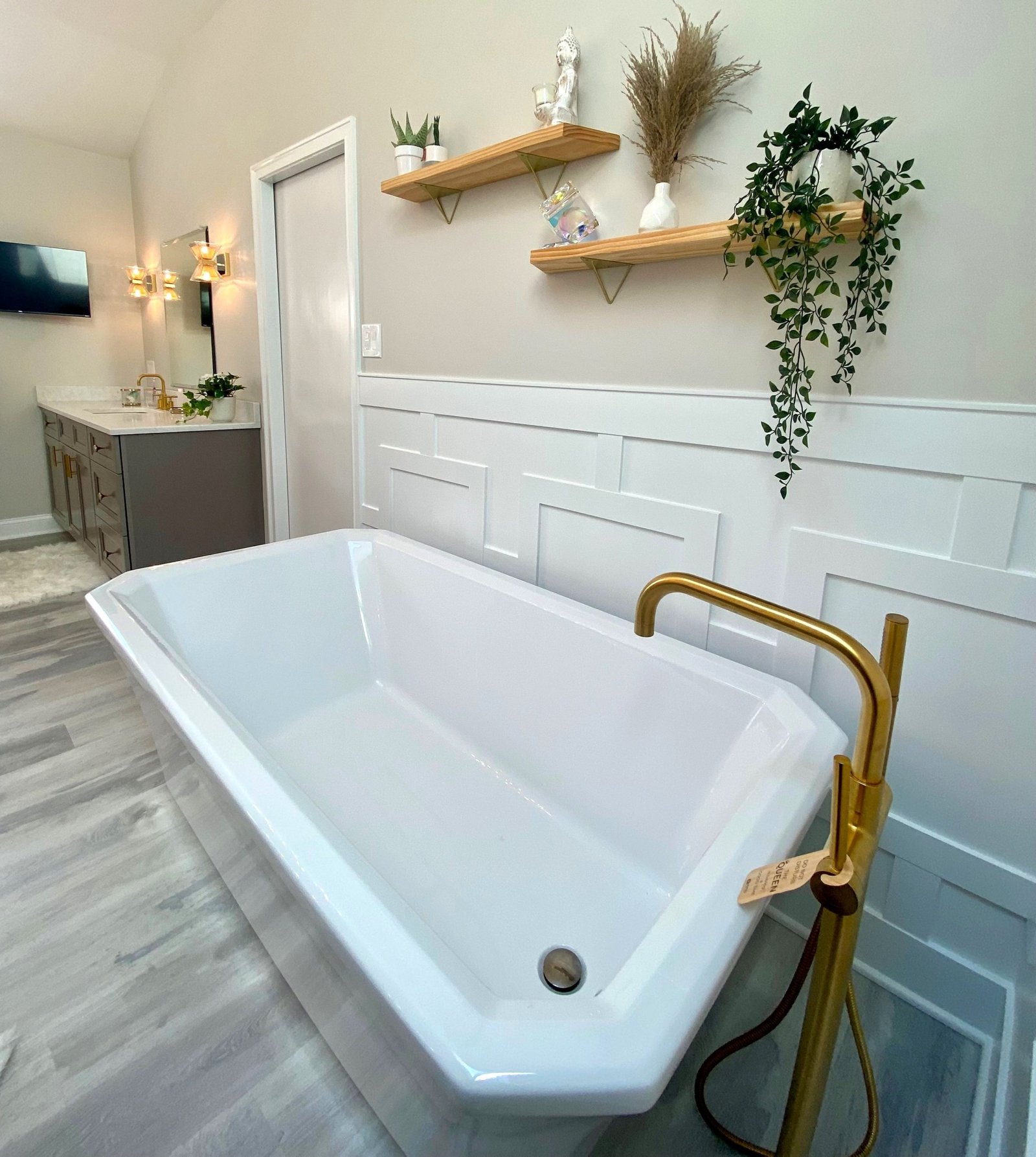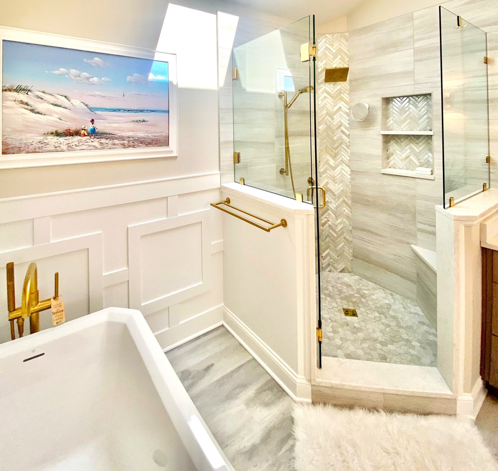 The centerpiece of the bathroom is the freestanding soaking tub, positioned against a custom white paneled wall that adds depth and architectural interest. Above, floating wood shelves provide a warm, natural touch while displaying curated décor. Just steps away, a frameless glass shower with floor-to-ceiling tile creates a spa-like experience. The herringbone accent wall inside the shower adds texture and visual intrigue, while a built-in bench and recessed shelving enhance both functionality and style.