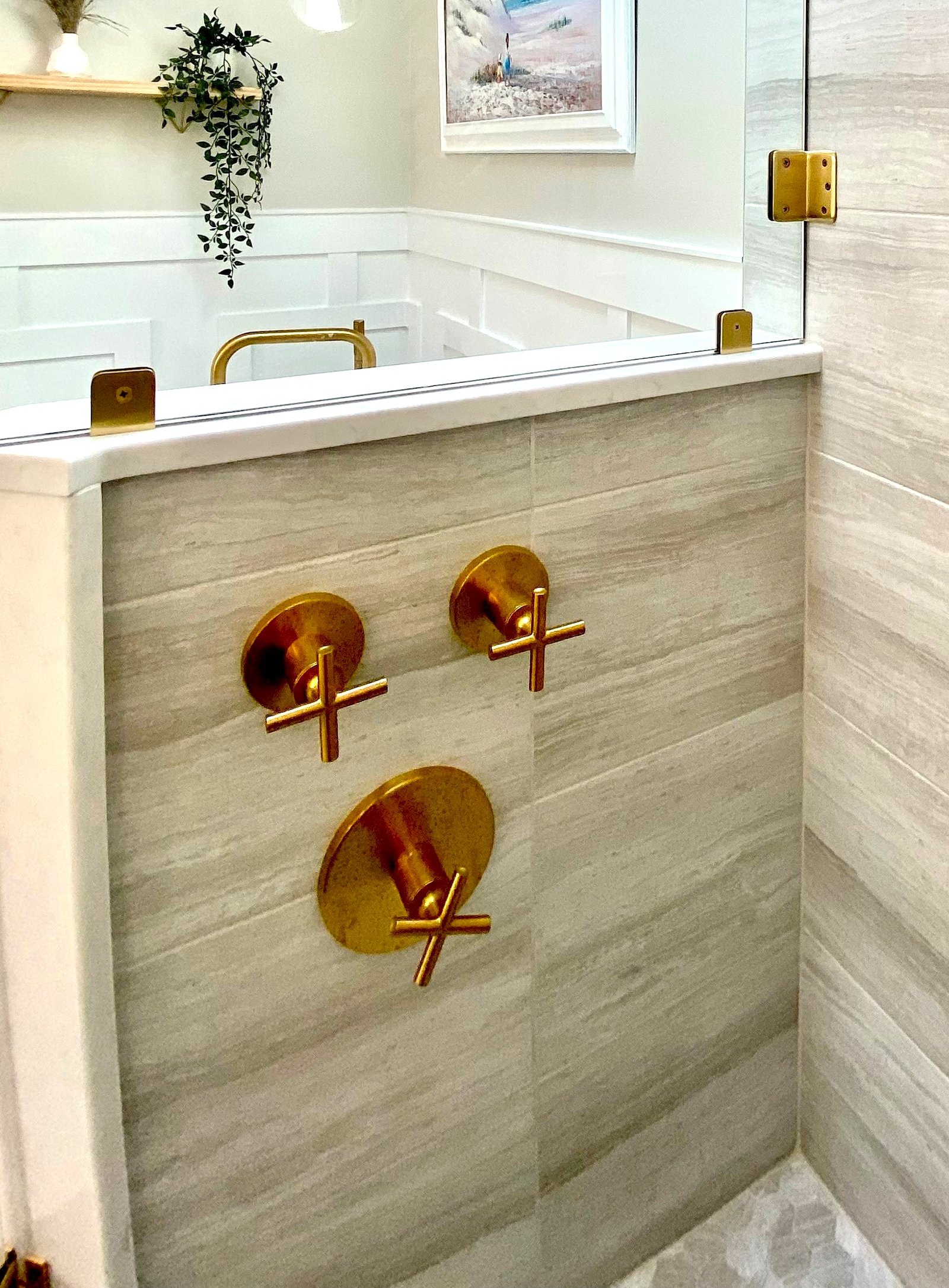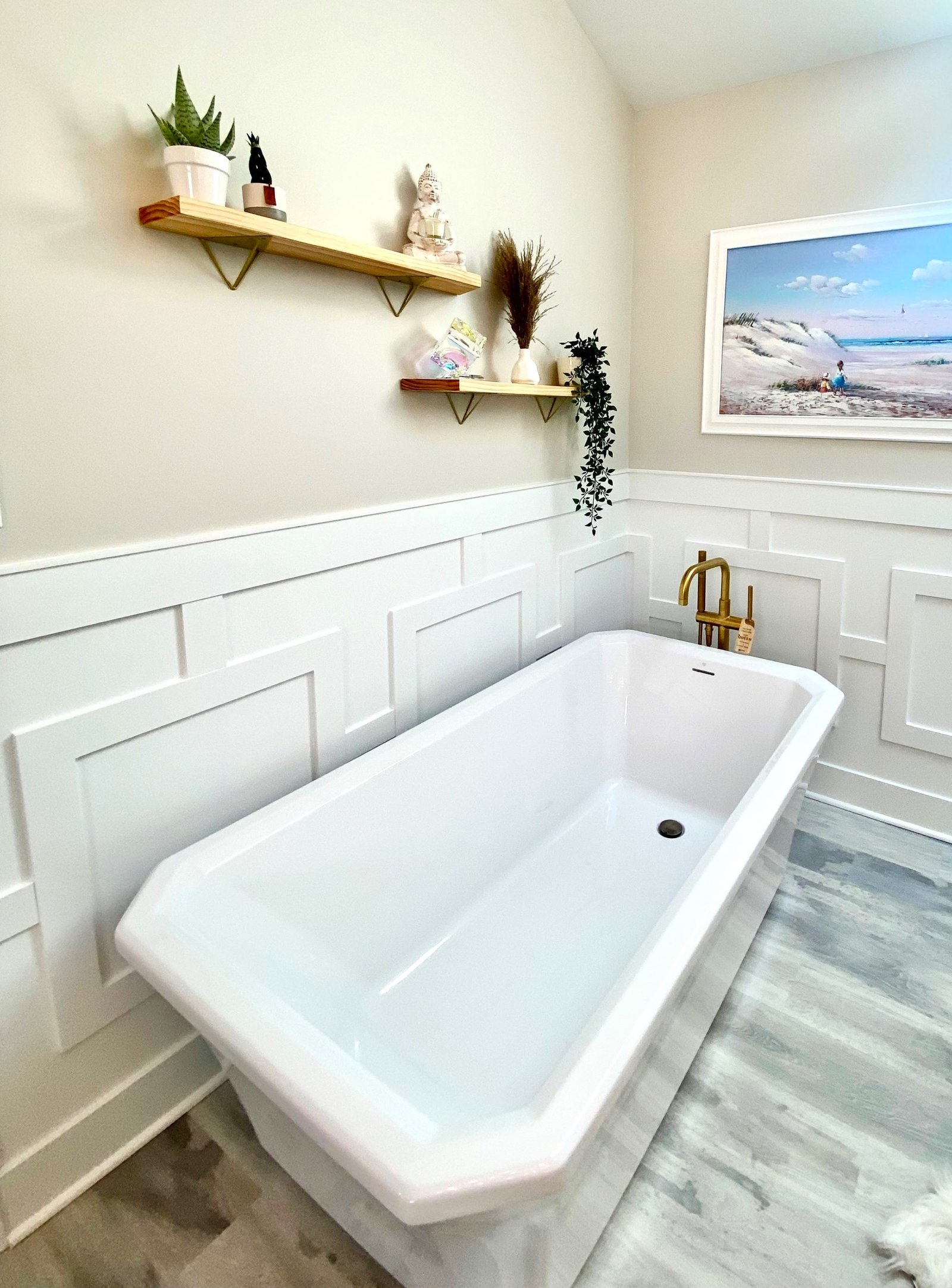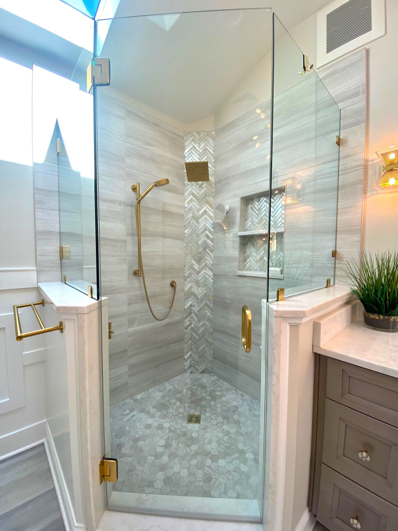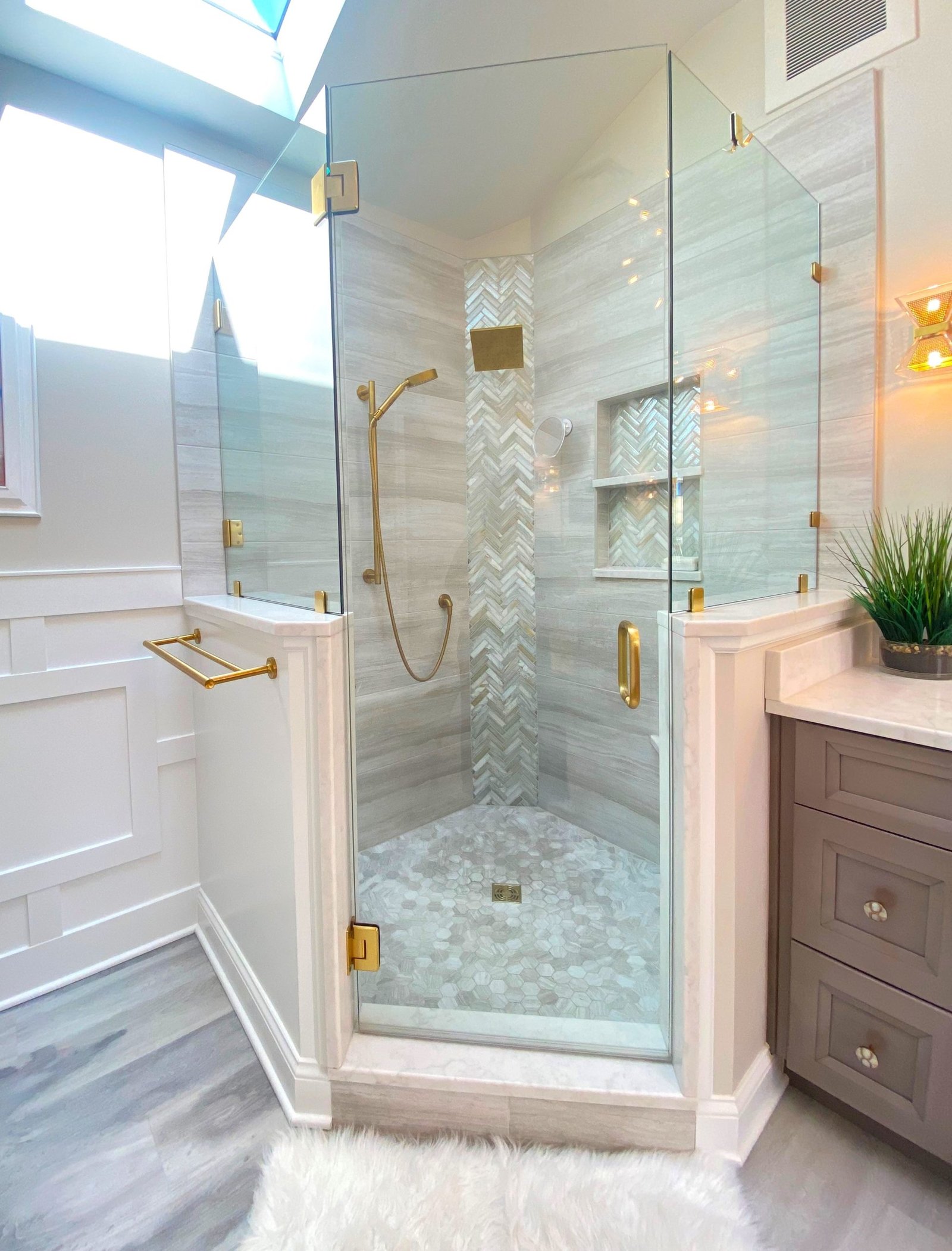 The centerpiece of the bathroom is the freestanding soaking tub, positioned against a custom white paneled wall that adds depth and architectural interest. Above, floating wood shelves provide a warm, natural touch while displaying curated décor. Just steps away, a frameless glass shower with floor-to-ceiling tile creates a spa-like experience. The herringbone accent wall inside the shower adds texture and visual intrigue, while a built-in bench and recessed shelving enhance both functionality and style.