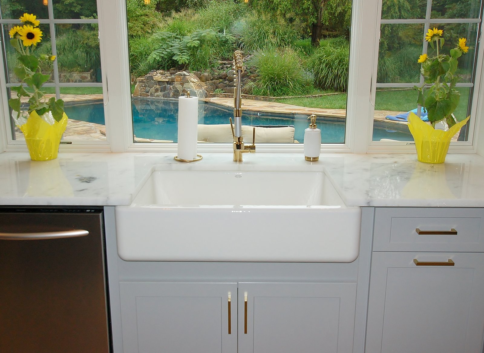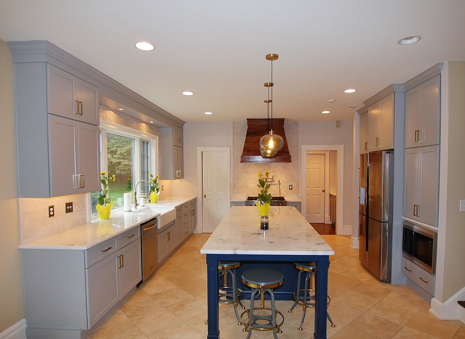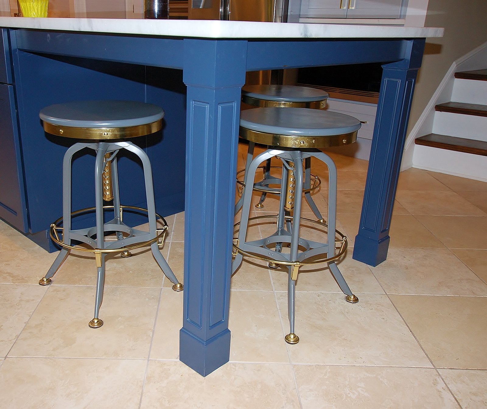 Cabinetry with Navy Island and Marble Accents