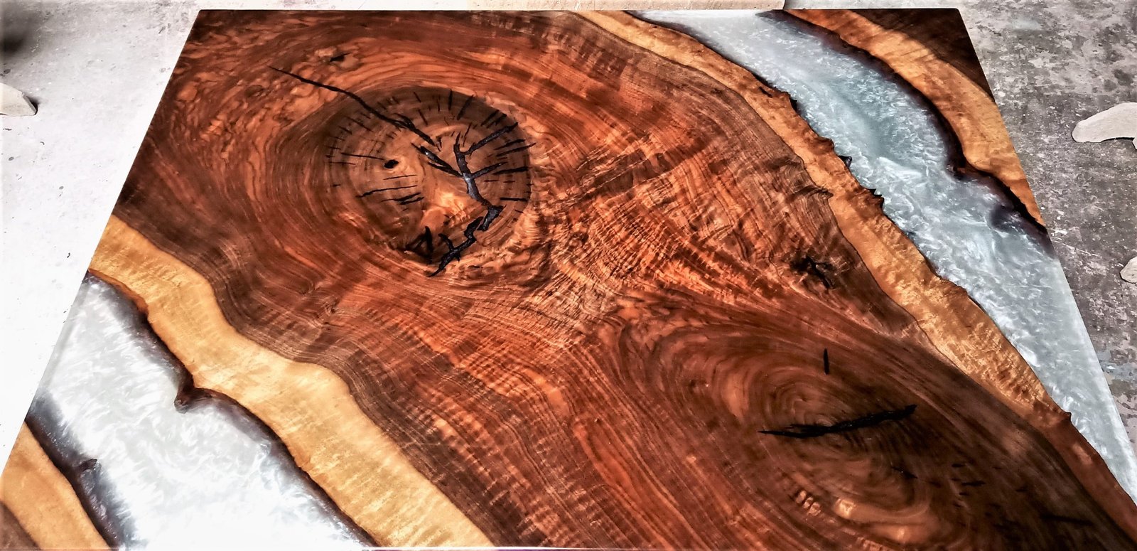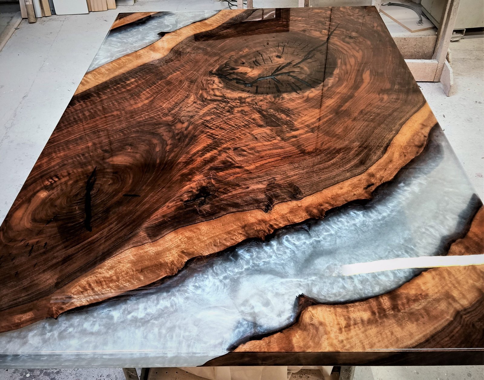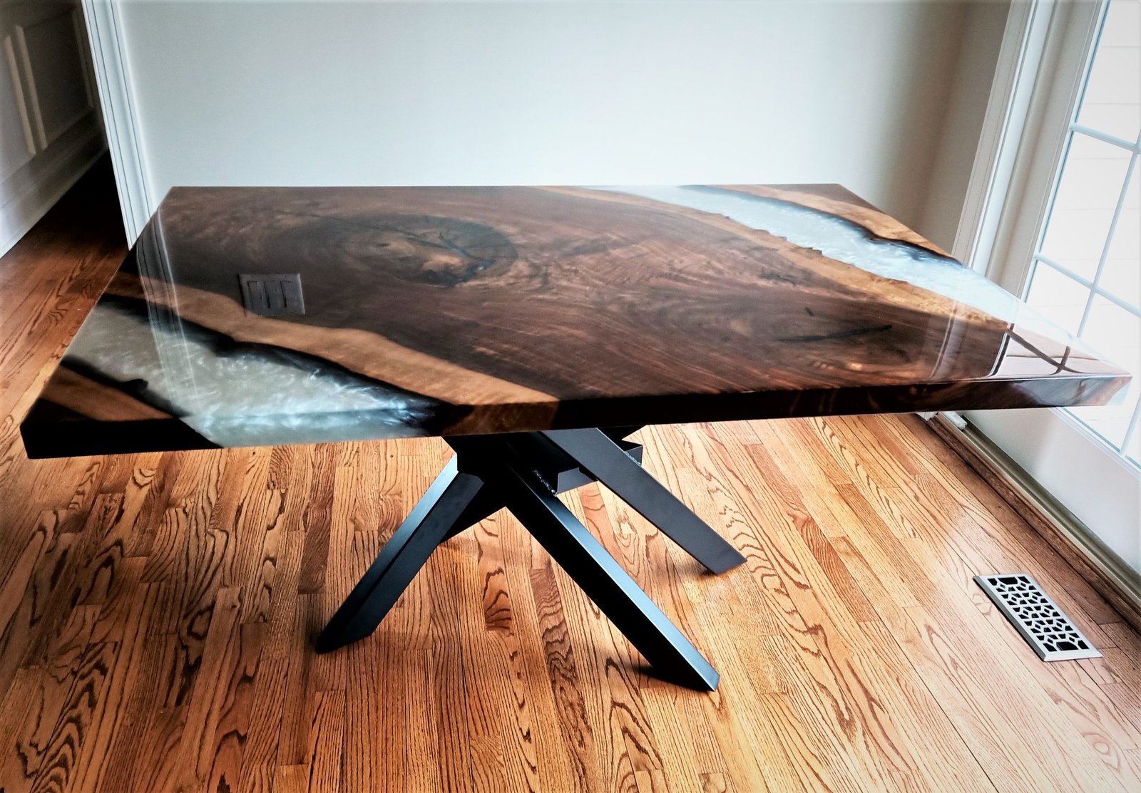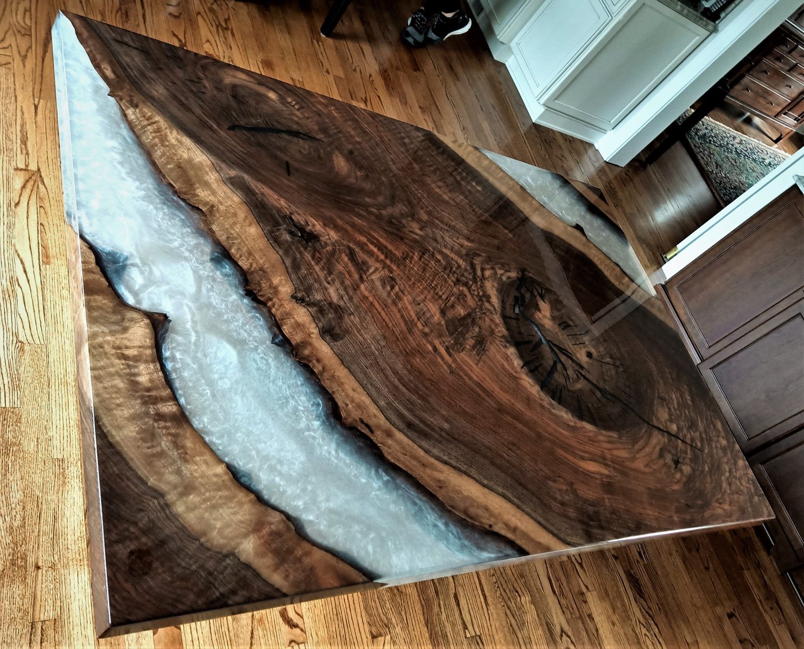 This custom river table project showcases the artistry and craftsmanship of Chester County Kitchen & Bath in Chester County, PA. Designed as both a statement piece and a functional table, the build features a solid live-edge walnut slab with striking natural grain patterns and organic voids. To enhance the wood’s beauty, a pearl-toned epoxy resin was poured between the slabs, creating a flowing “river” effect that adds movement and depth. The high-gloss finish brings out the natural character of the walnut while providing long-lasting durability. A modern steel base completes the design, offering strength and contrast to the organic top. This one-of-a-kind table reflects our commitment to custom, locally built furniture that elevates everyday living spaces.