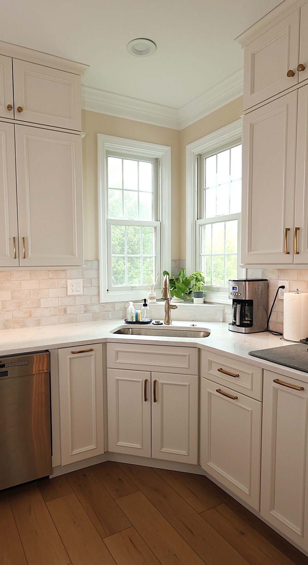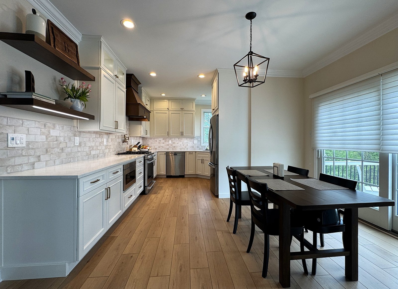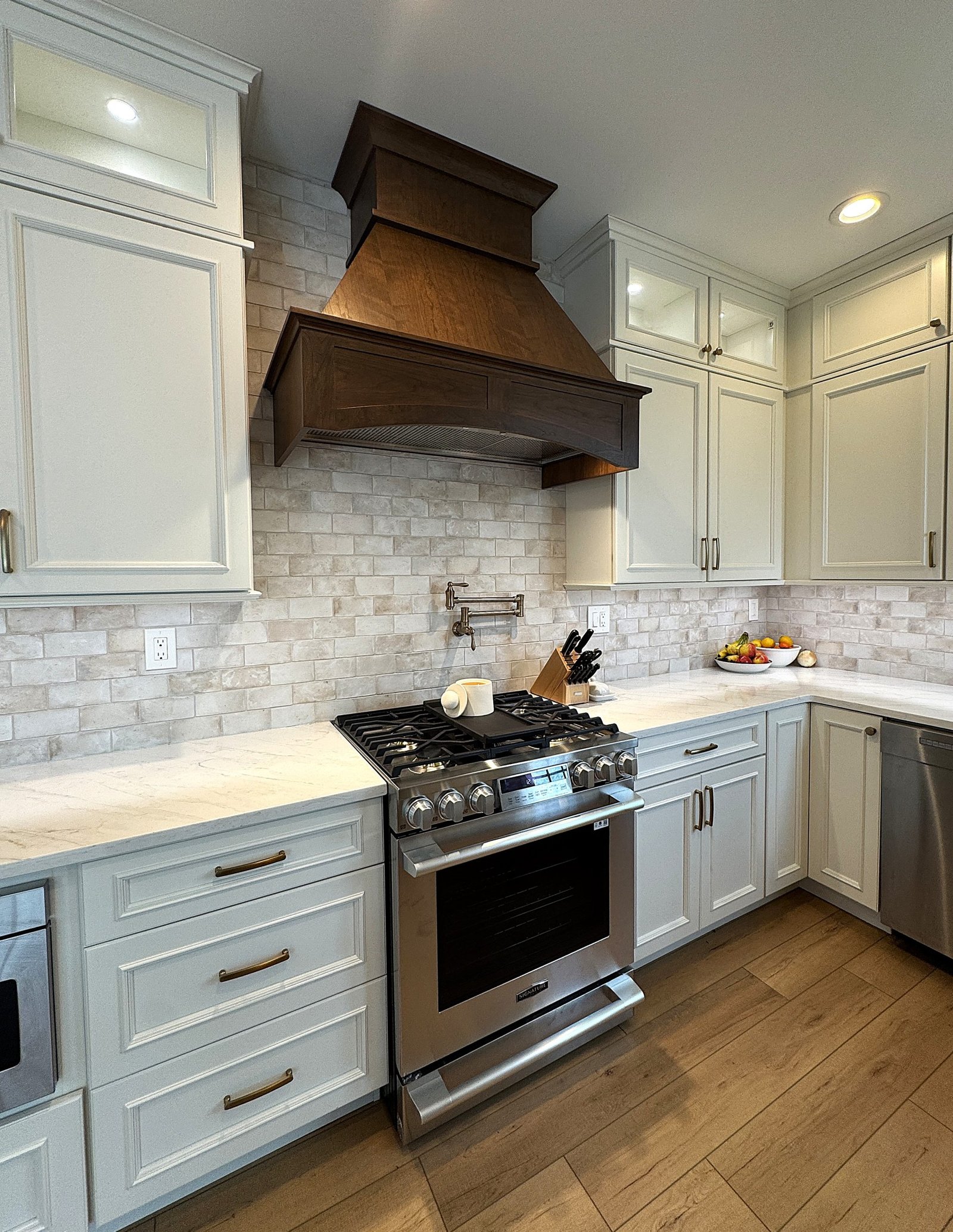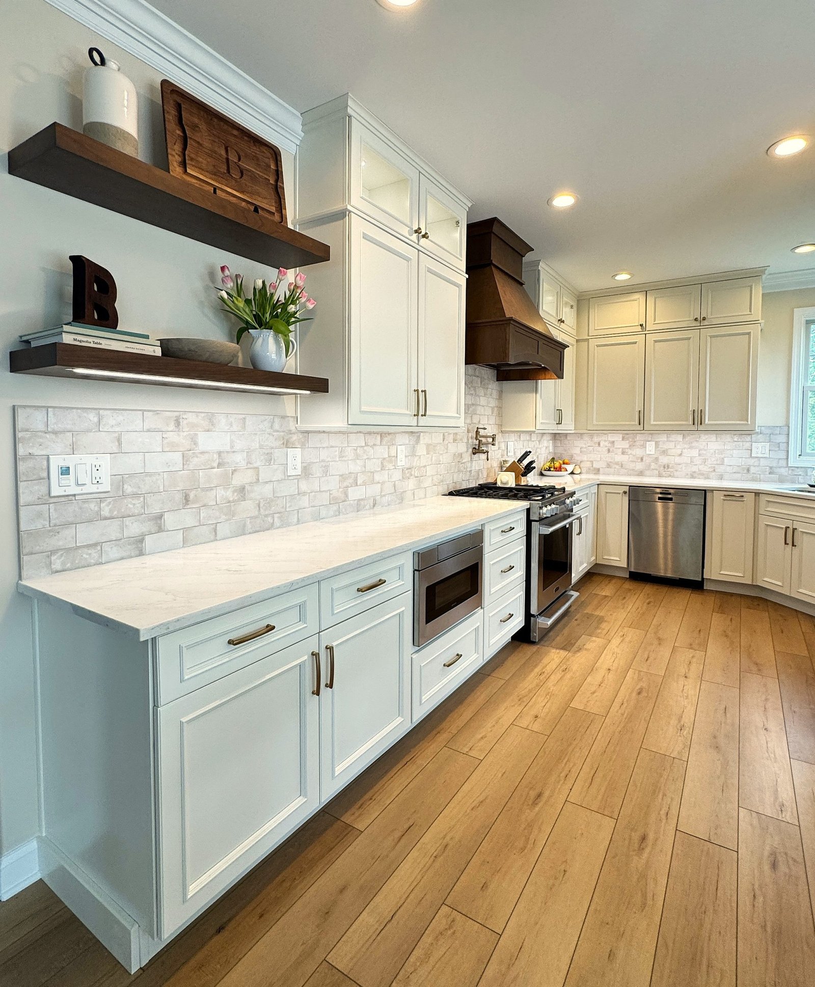 This Chester County, PA kitchen remodel showcases a perfect balance of bright, modern design and warm, natural accents. Custom white cabinetry extends to the ceiling, offering ample storage and a clean, timeless look. The centerpiece is a rich walnut-stained custom range hood, paired with matching floating shelves that add warmth and character. Elegant quartz countertops provide a durable and beautiful workspace, complemented by a soft-toned tile backsplash for subtle texture. Thoughtful details, including under-cabinet lighting and brass hardware, complete the look. Designed for both functionality and style, this kitchen delivers a welcoming space ideal for cooking, dining, and entertaining.