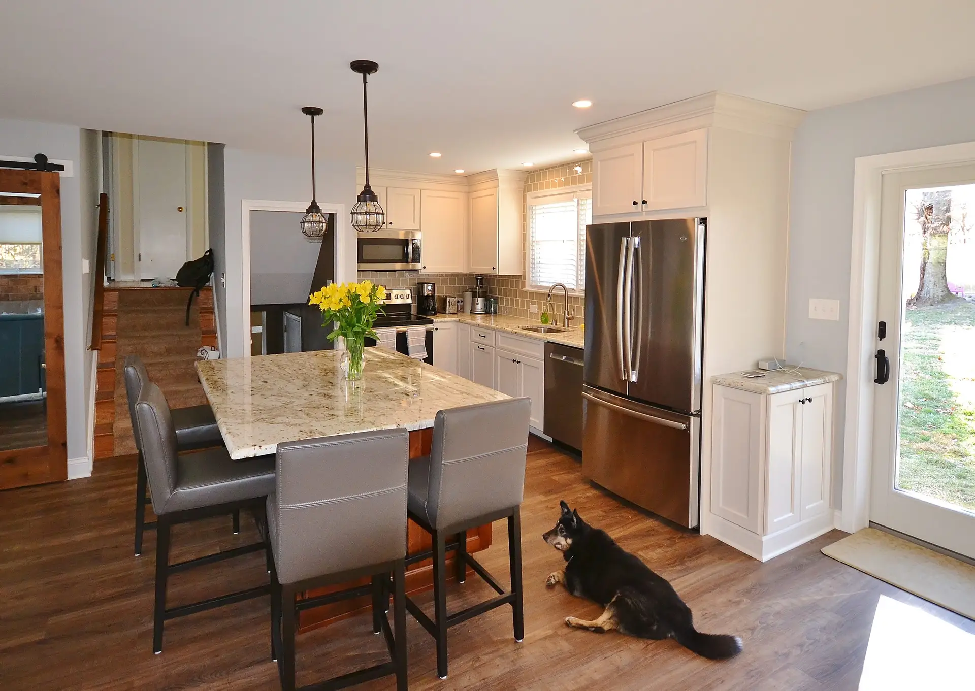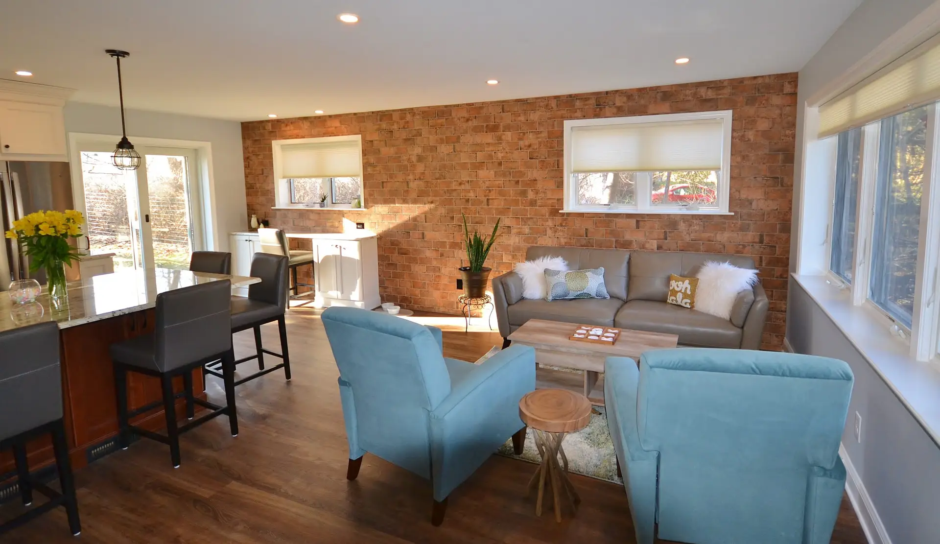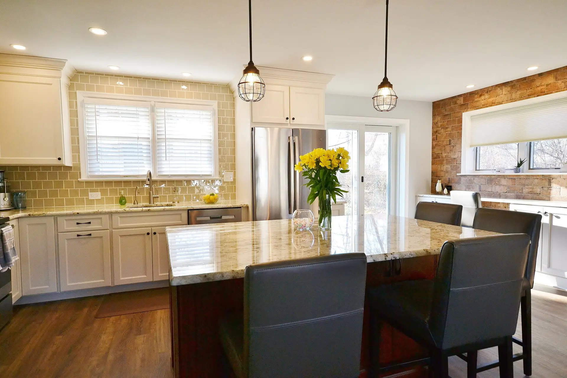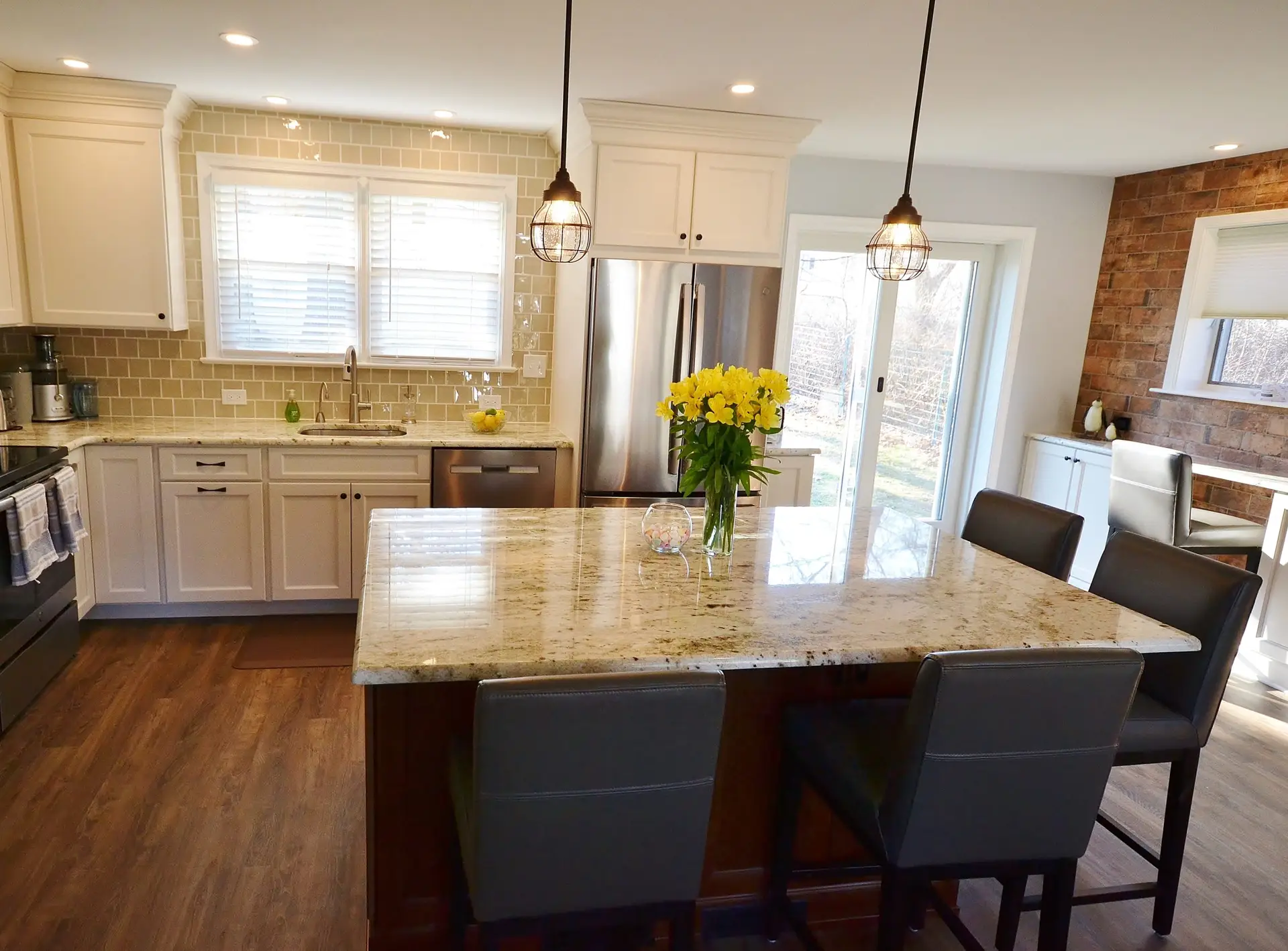 This beautifully remodeled kitchen balances warmth and sophistication with a seamless open-concept layout. The focal point is a large granite island paired with rich wood cabinetry, offering ample prep space and casual seating. Crisp white cabinets and sleek stainless-steel appliances create a clean, timeless look, while the textured brick accent wall adds a touch of rustic charm and warmth to the space. Natural light floods in through expansive windows and sliding glass doors, connecting the kitchen to the outdoors. The adjacent cozy seating area with plush chairs makes this kitchen equally perfect for entertaining and everyday living.