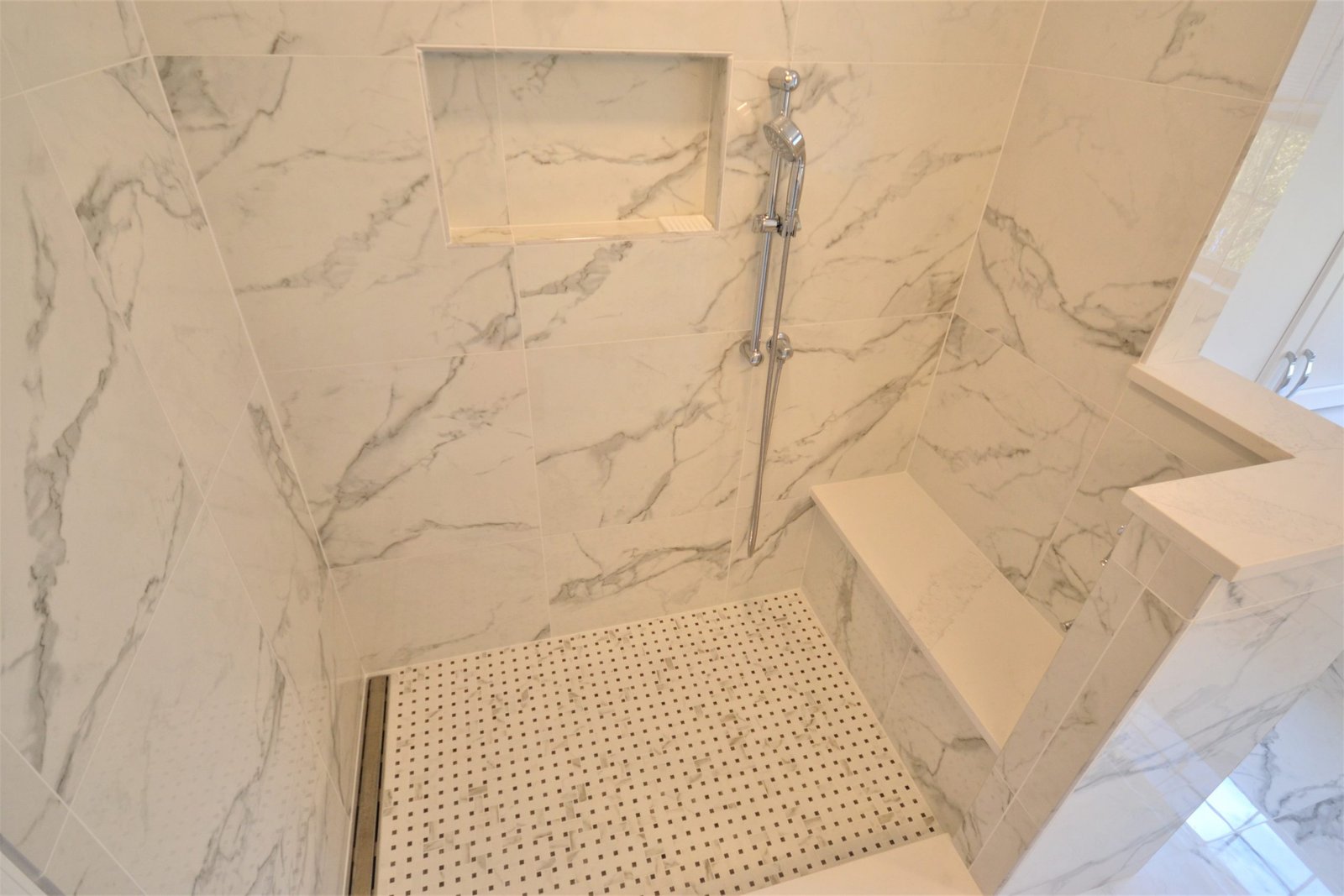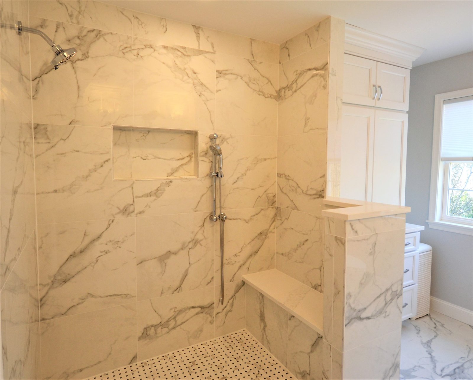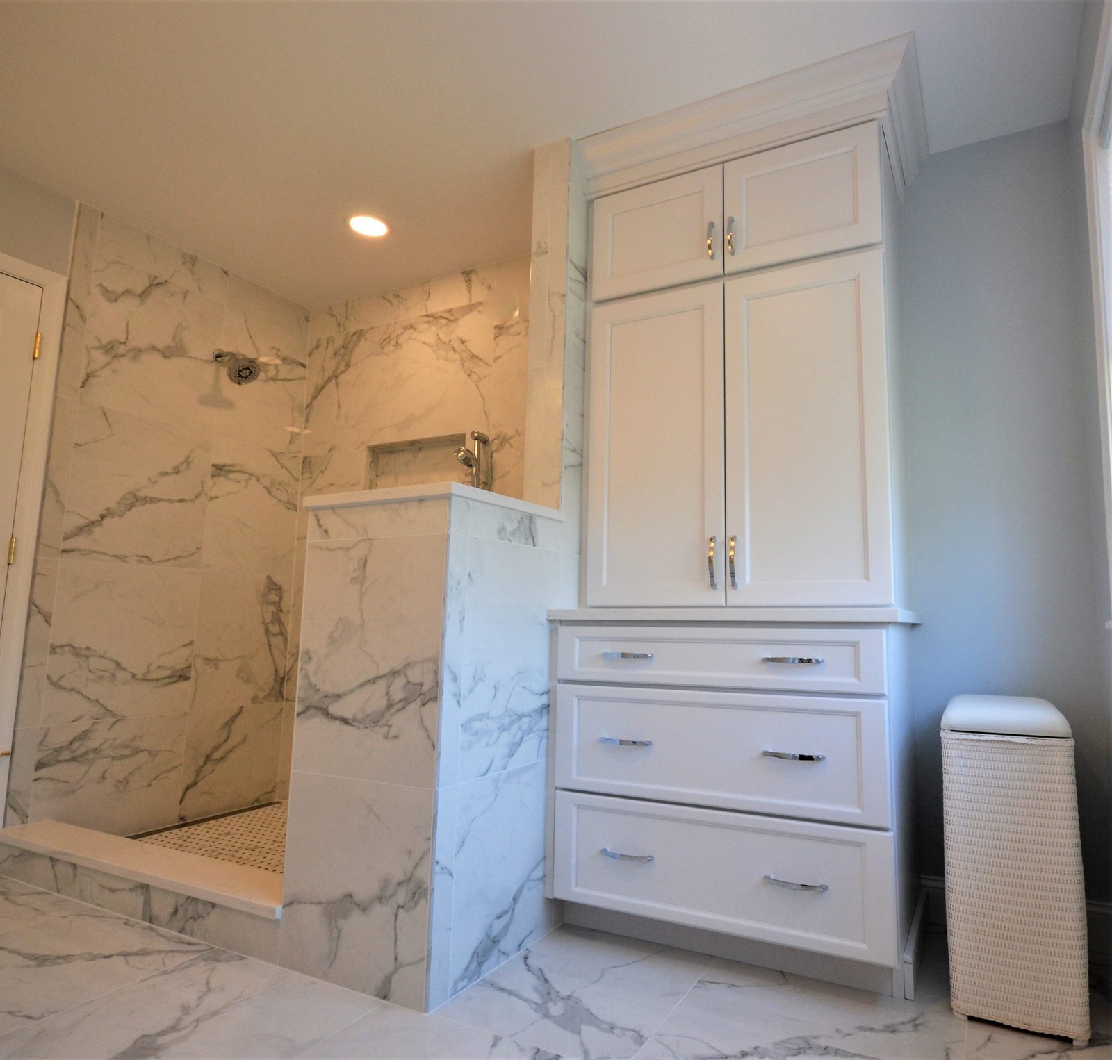 This bathroom renovation captures the essence of luxury with its striking marble finishes and carefully planned layout. The walk-in shower, complete with built-in bench and niche, offers both comfort and convenience. Custom white cabinetry enhances storage while maintaining a clean, classic aesthetic. Polished chrome fixtures and soft lighting add subtle elegance, completing a design that feels both sophisticated and inviting. Perfectly balanced, this space transforms daily routines into moments of relaxation.