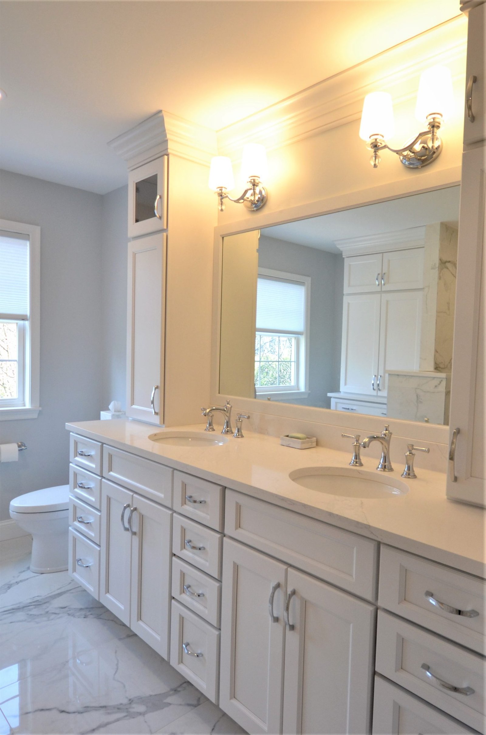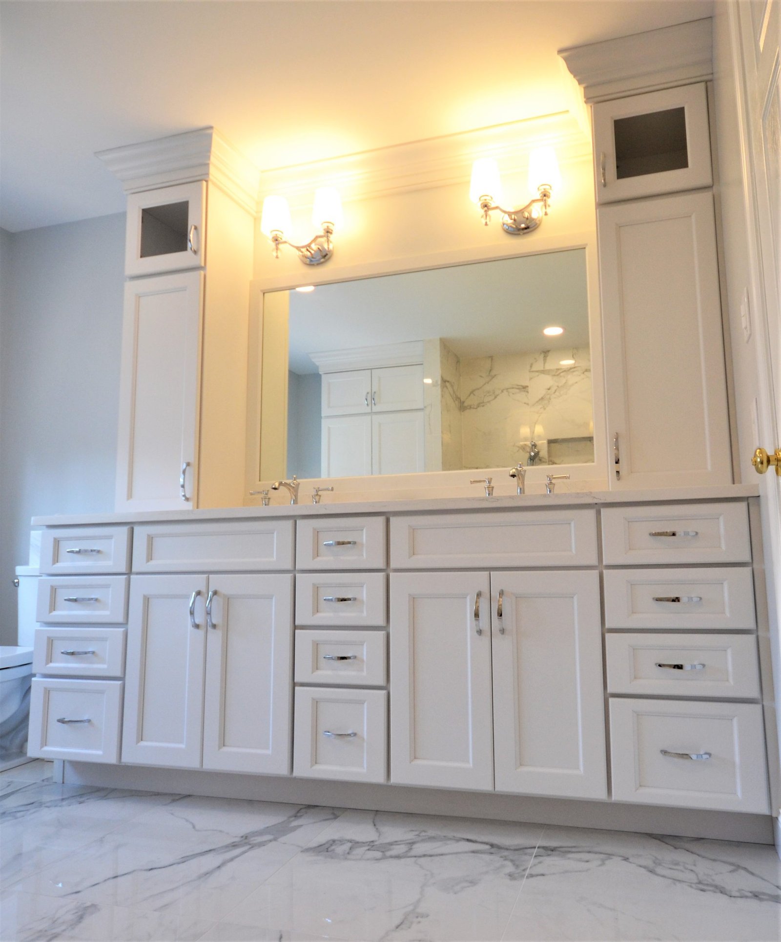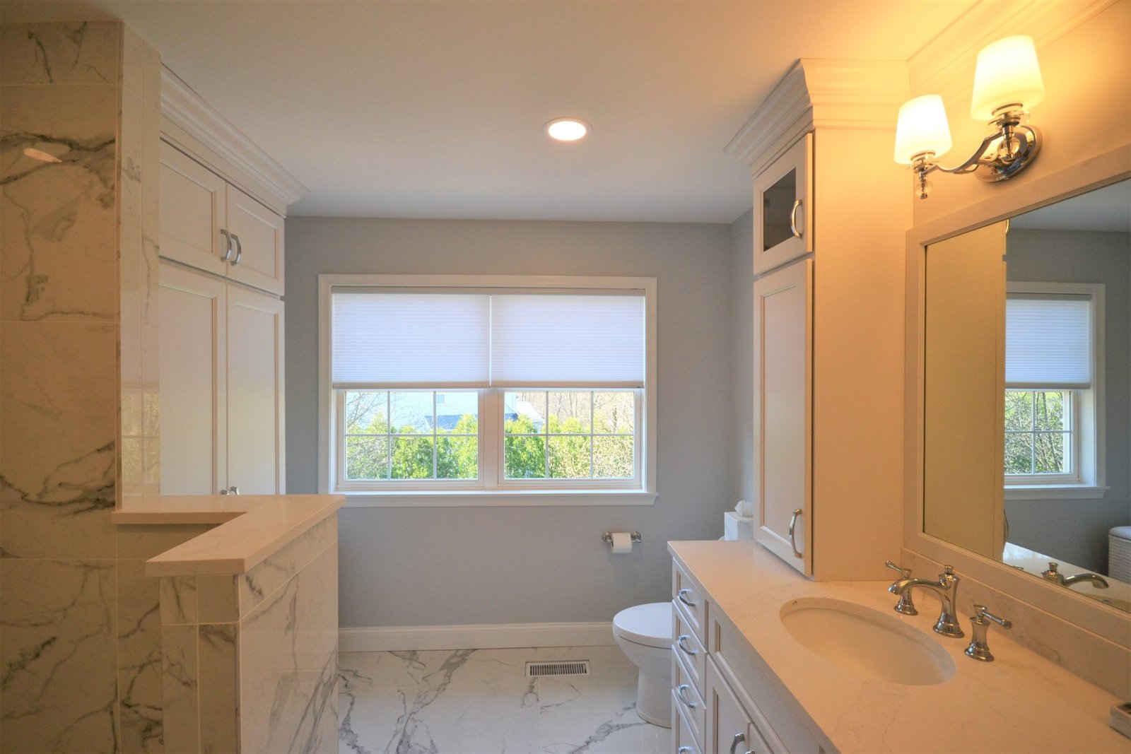This bathroom renovation captures the essence of luxury with its striking marble finishes and carefully planned layout. The walk-in shower, complete with built-in bench and niche, offers both comfort and convenience. Custom white cabinetry enhances storage while maintaining a clean, classic aesthetic. Polished chrome fixtures and soft lighting add subtle elegance, completing a design that feels both sophisticated and inviting. Perfectly balanced, this space transforms daily routines into moments of relaxation.