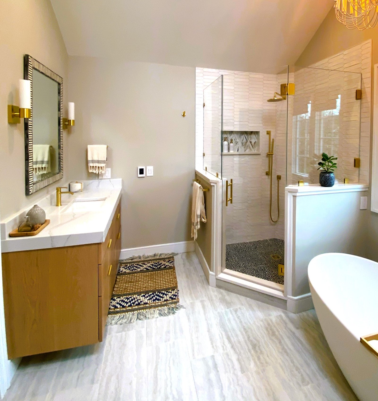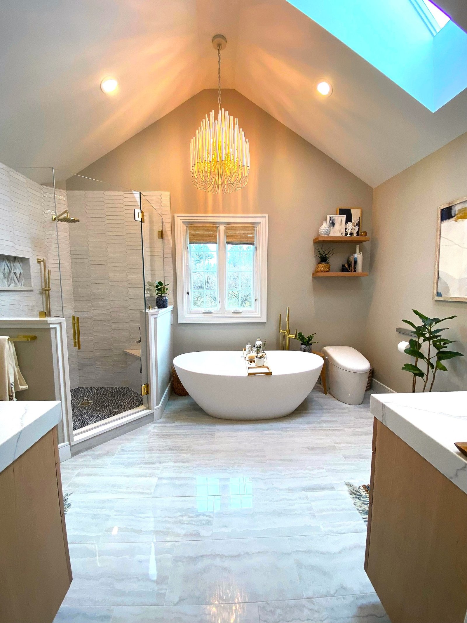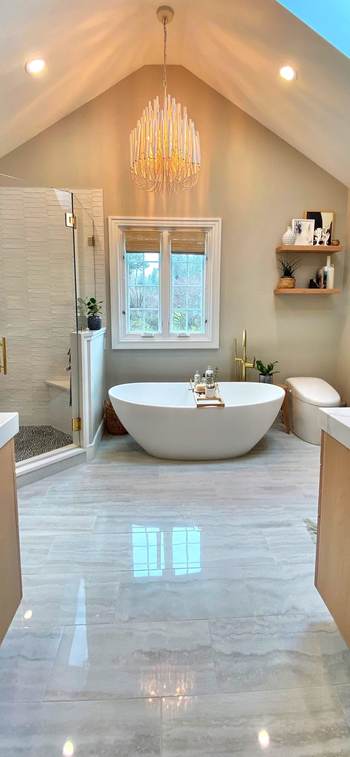 A freestanding soaking tub sits by the window, paired with a sleek gold tub filler that adds both function and style. Floating wood shelves provide space for décor while keeping the design light and natural. The large glass shower features striking white textured tile walls, a mosaic stone floor, and recessed niches with accent tile for added detail. A built-in bench enhances functionality, while gold fixtures bring elegance throughout.