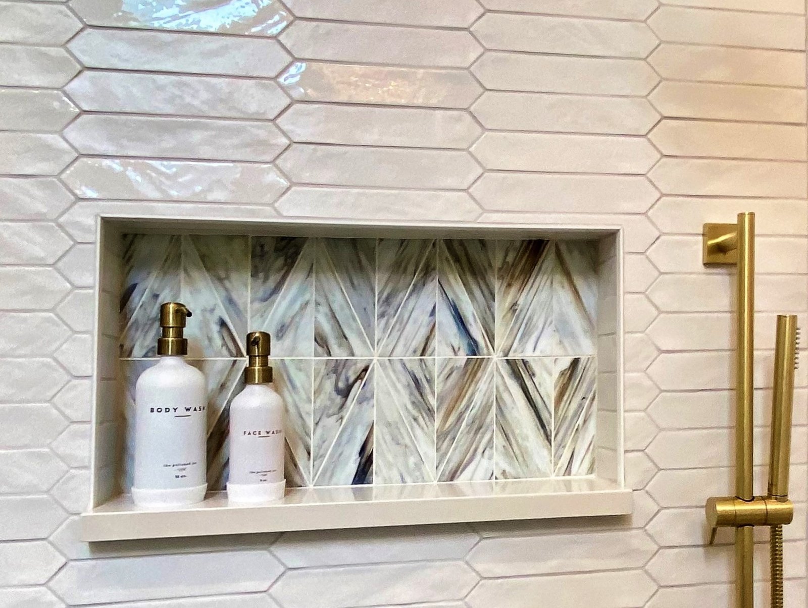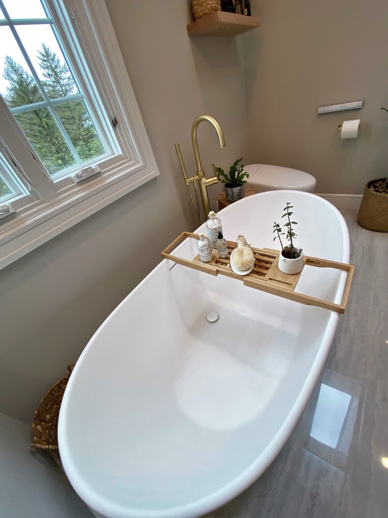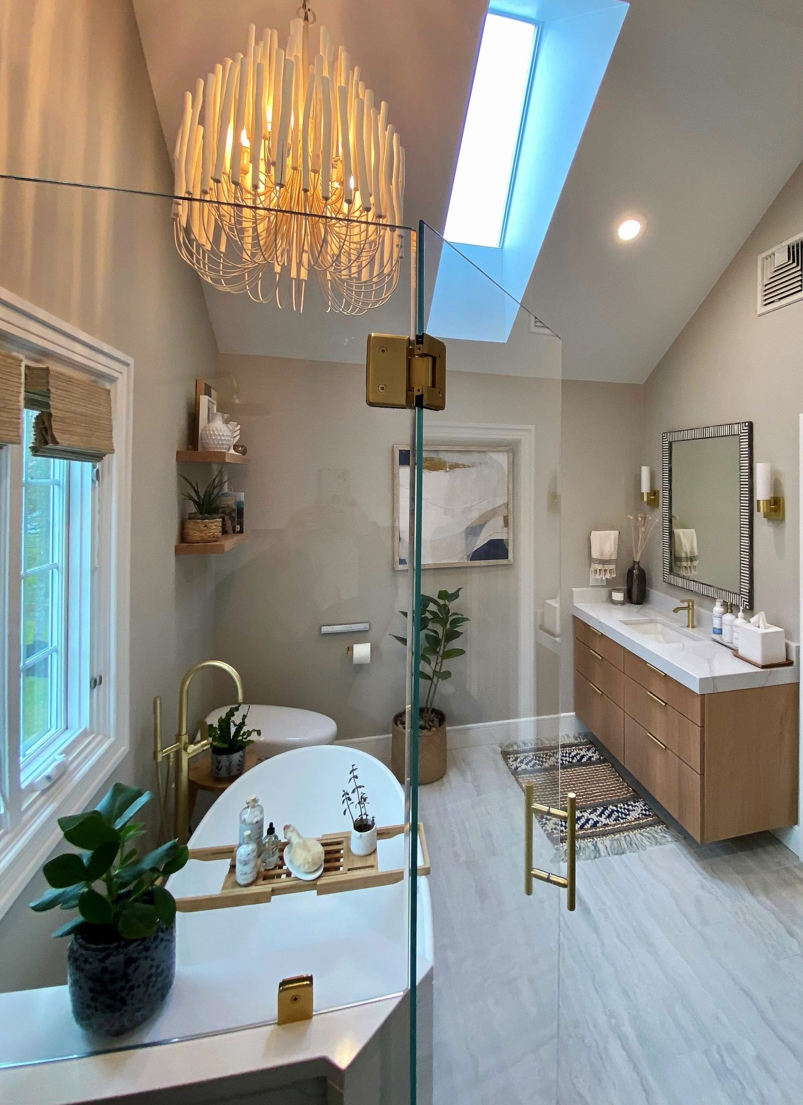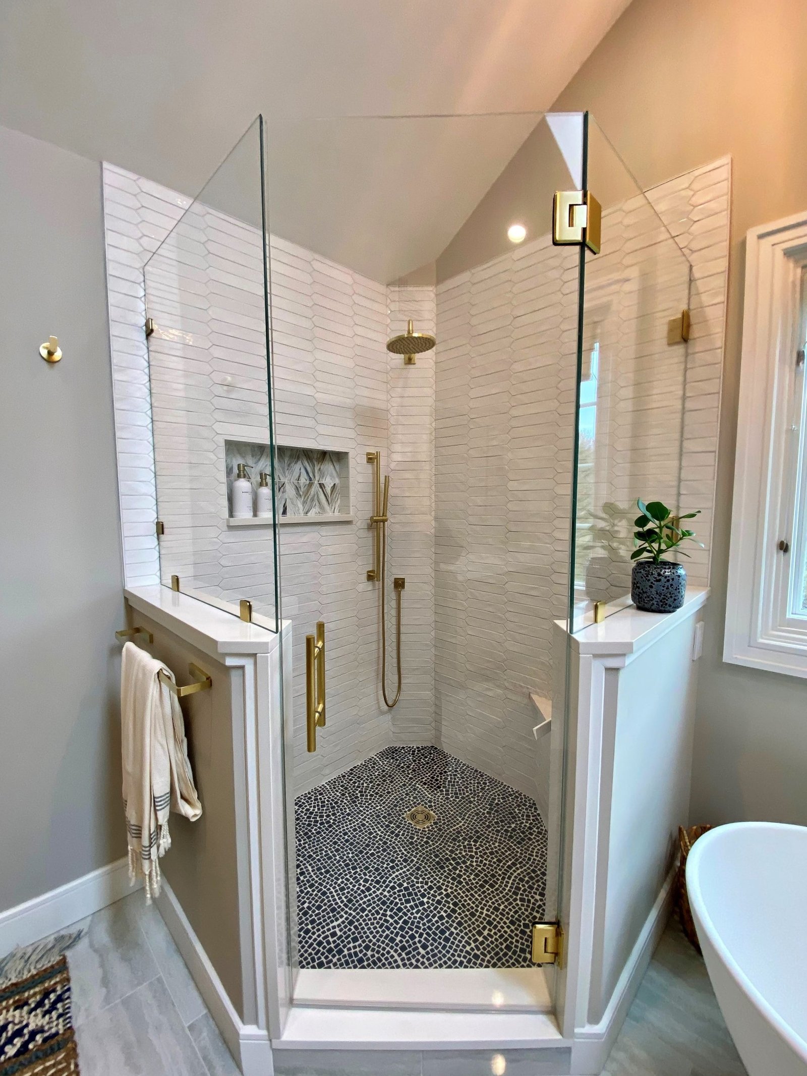 A freestanding soaking tub sits by the window, paired with a sleek gold tub filler that adds both function and style. Floating wood shelves provide space for décor while keeping the design light and natural. The large glass shower features striking white textured tile walls, a mosaic stone floor, and recessed niches with accent tile for added detail. A built-in bench enhances functionality, while gold fixtures bring elegance throughout.