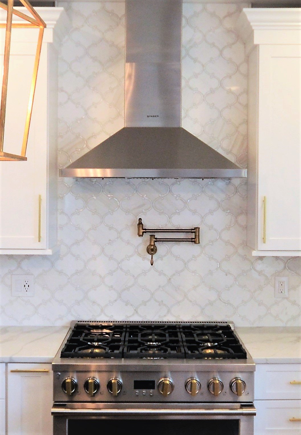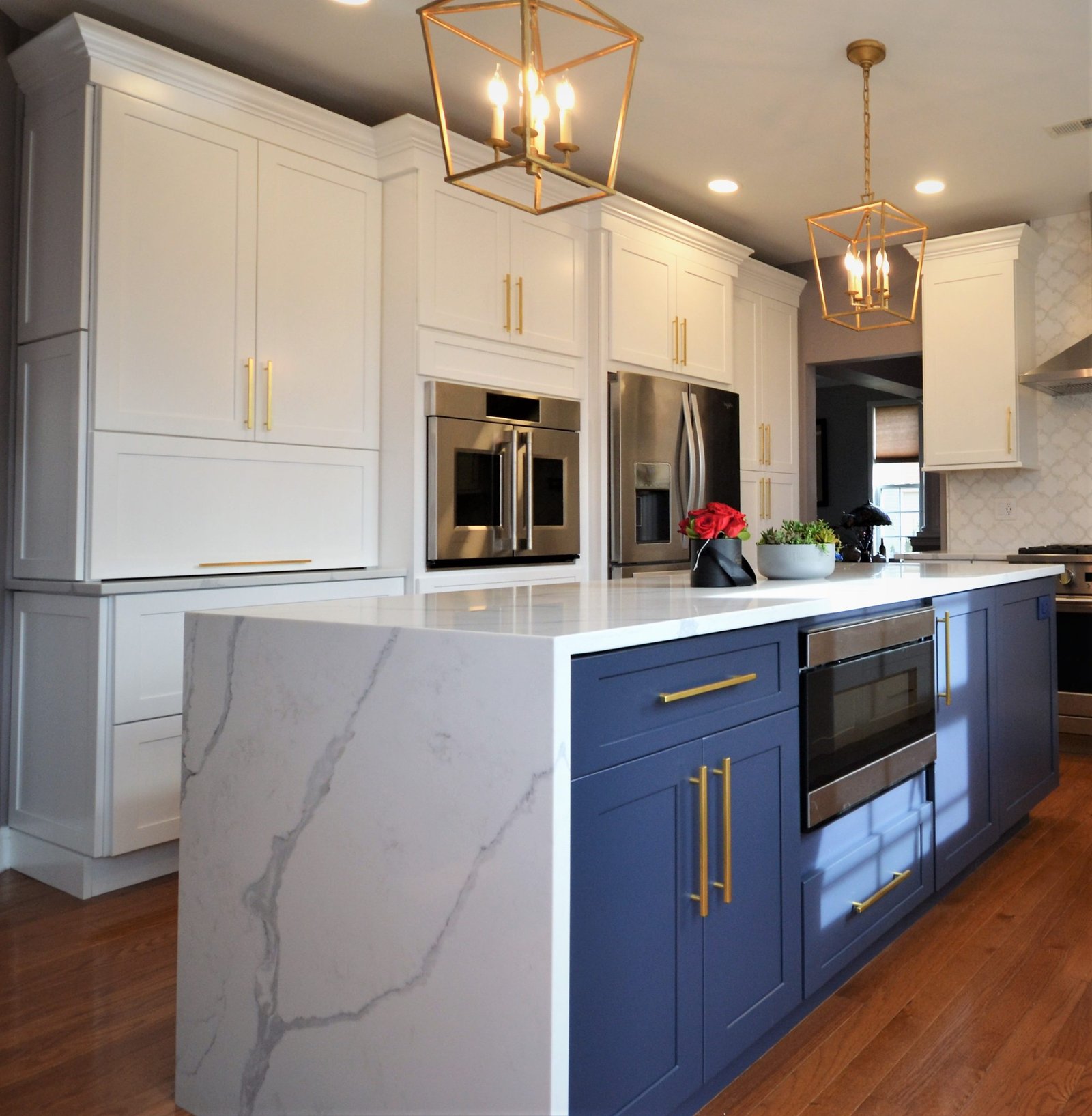 This stunning kitchen renovation showcases the perfect balance of bold and timeless design. Crisp white cabinets provide a clean backdrop, while the deep navy island adds dramatic contrast. Luxurious gold hardware and statement pendant lights elevate the space with a touch of glamour. The waterfall-edge quartz countertops create a seamless, high-end finish, complemented by an elegant patterned backsplash. Every detail—from the pot filler above the range to the built-in appliances—was chosen to combine functionality with beauty, resulting in a space that’s both stylish and inviting.