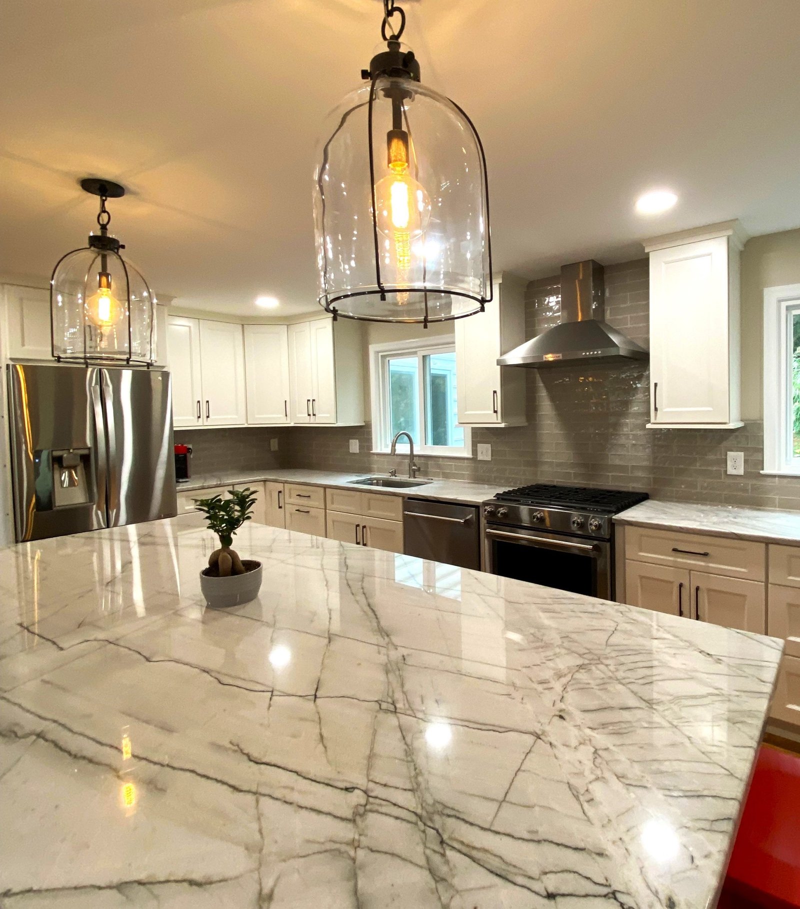 Striking Marble Island: A large marble island with rich dark cabinetry serves as the focal point, contrasting beautifully with surrounding white shaker cabinets.