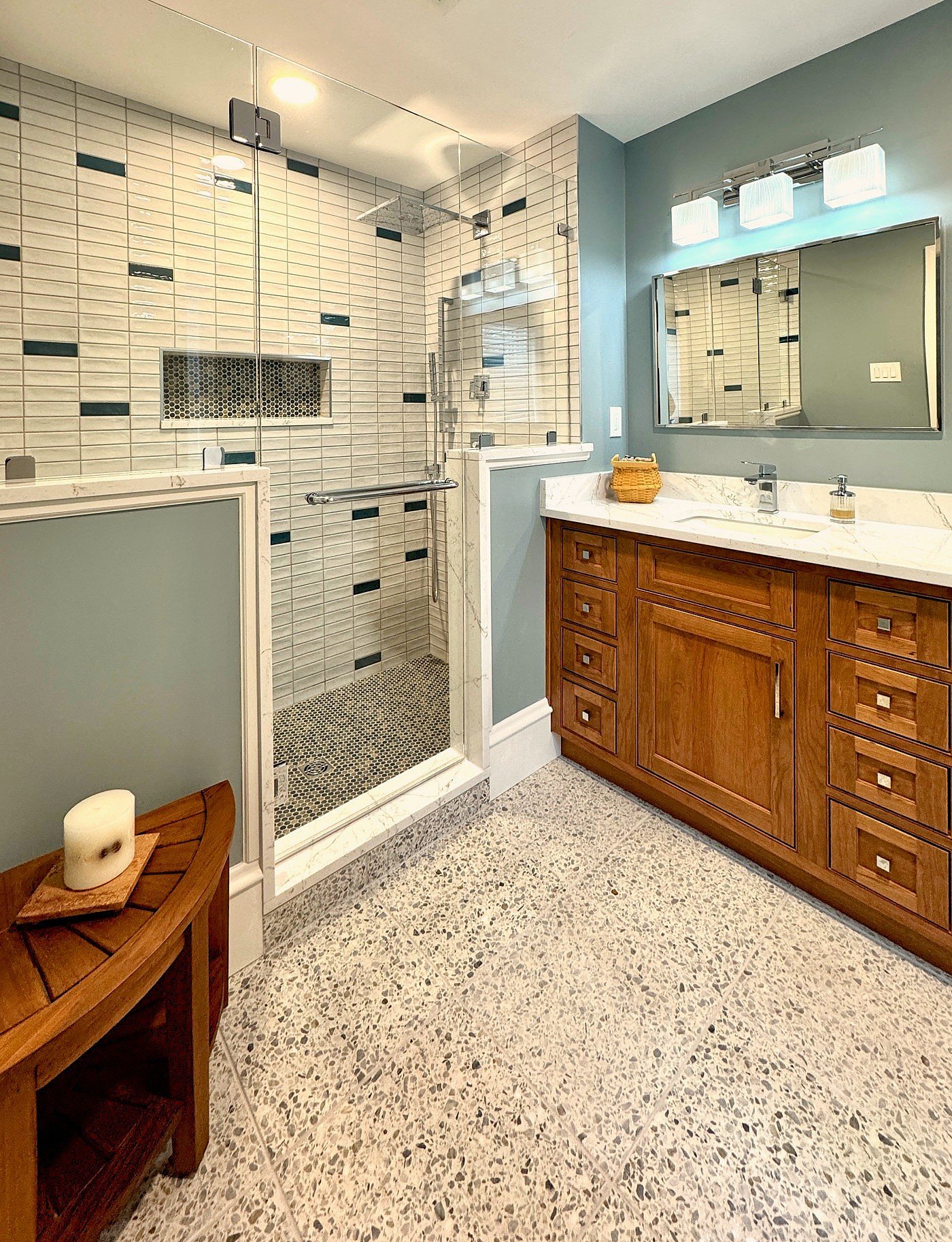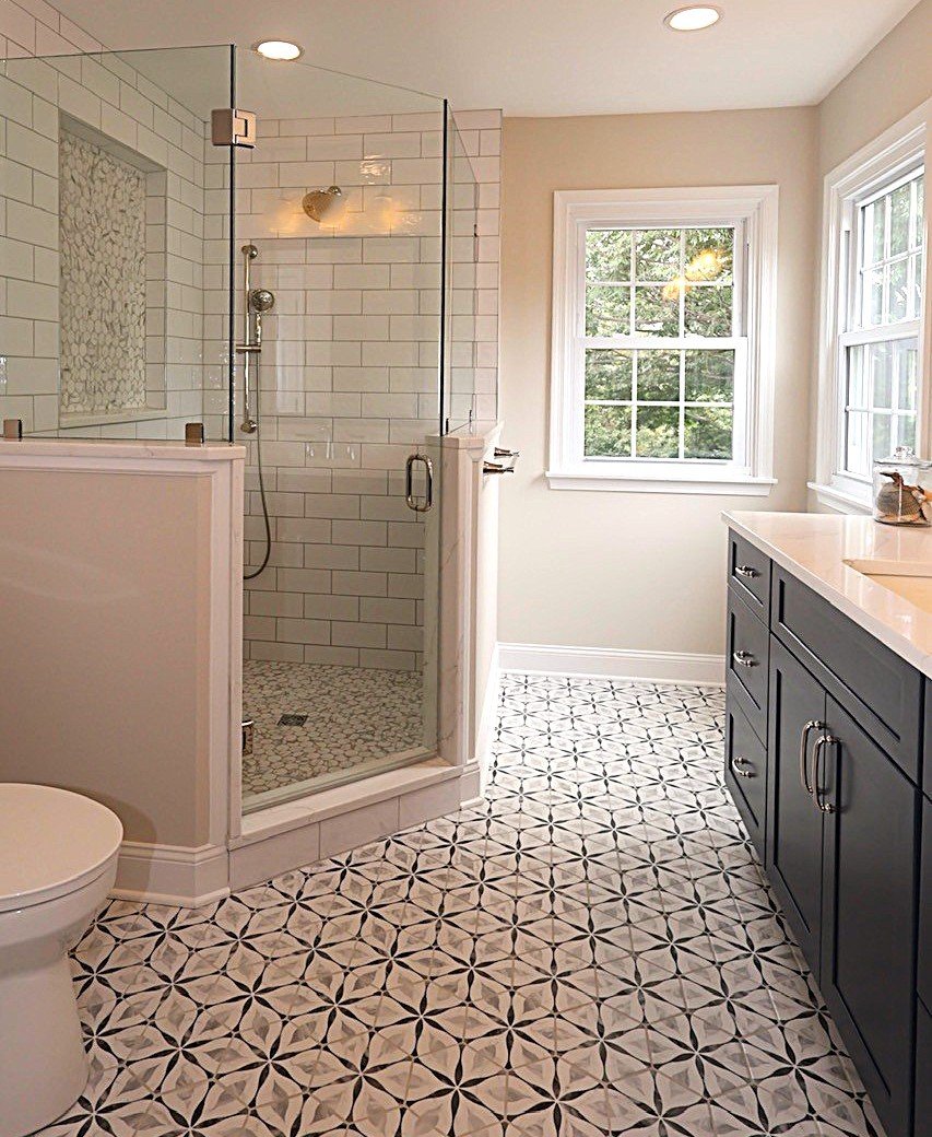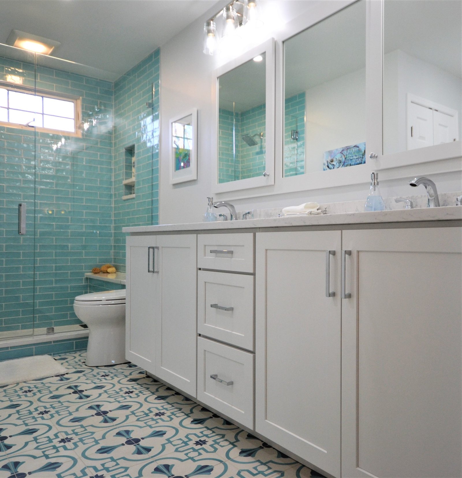 Bright Coastal Bathroom Remodel with Aqua Tile & Patterned Floor