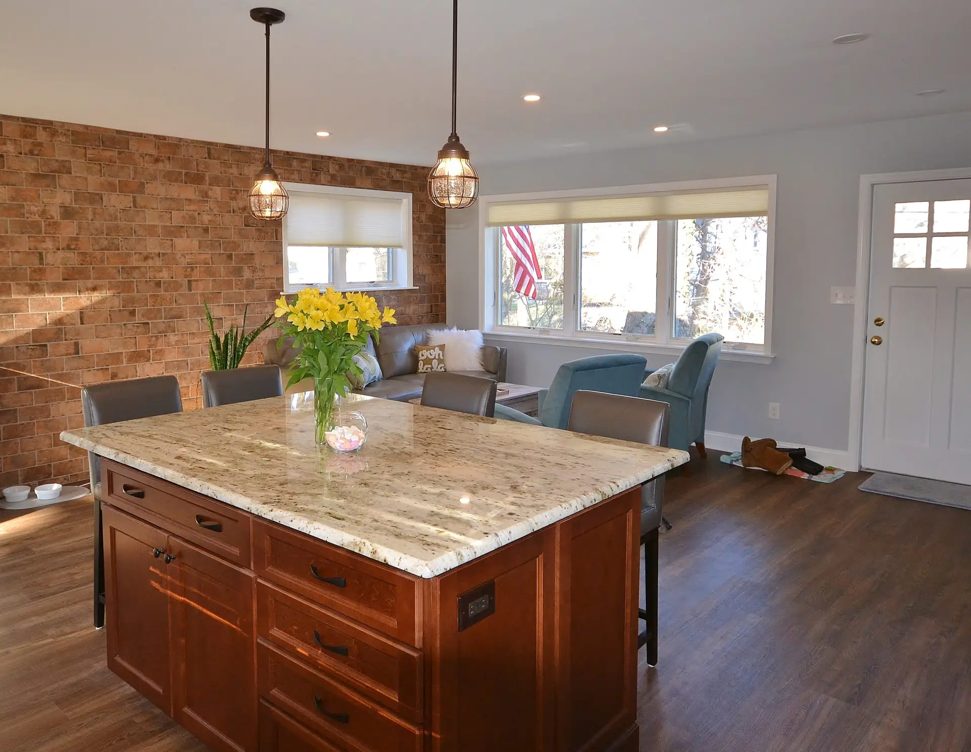Inviting Kitchen with Brick Feature Wall and Granite Island