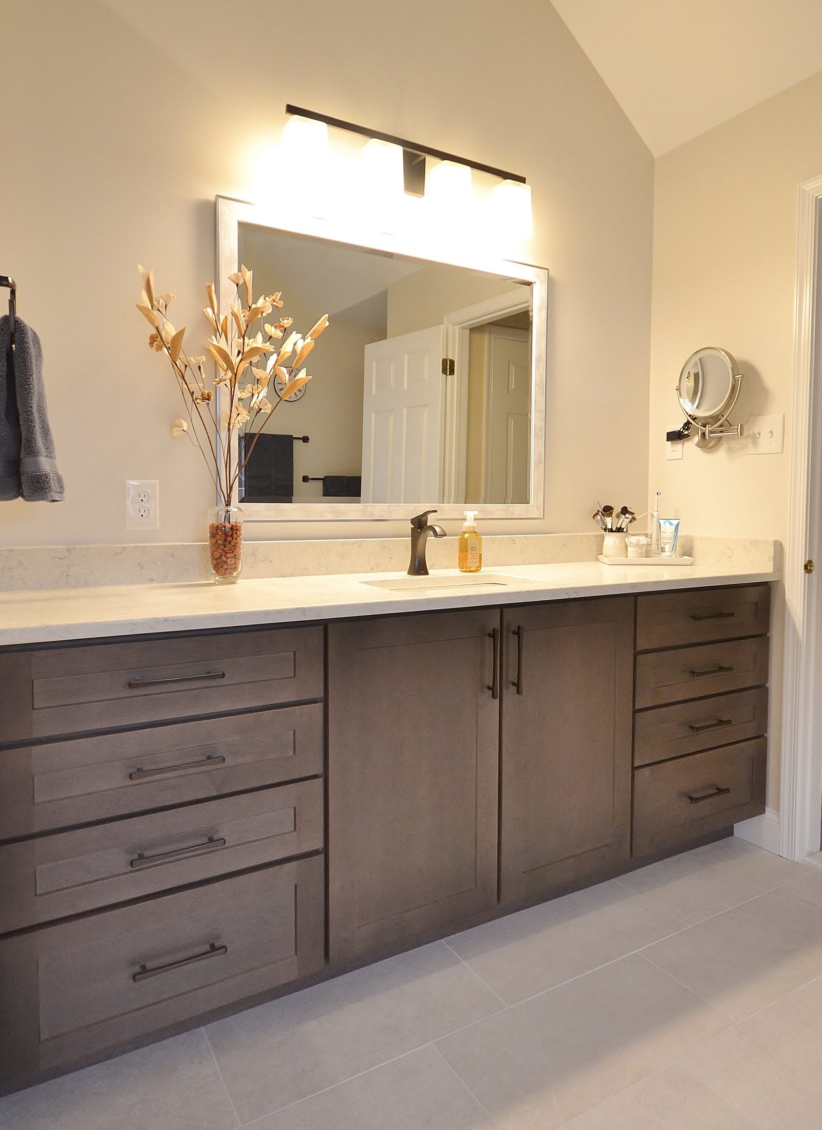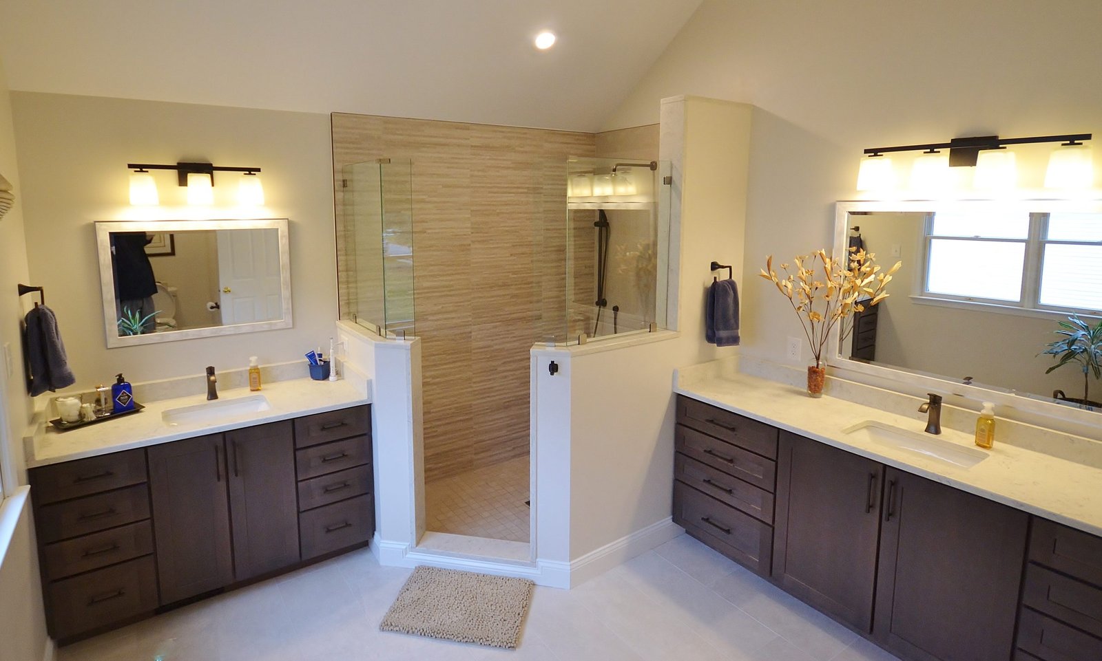 Designed for both function and relaxation, this bathroom transformation combines warm wood cabinetry with clean, contemporary finishes. The large glass-enclosed shower features a built-in bench and sleek fixtures, while dual vanities offer abundant storage and style. Neutral tones in tile and countertops create a serene, spa-inspired retreat perfect for unwinding.