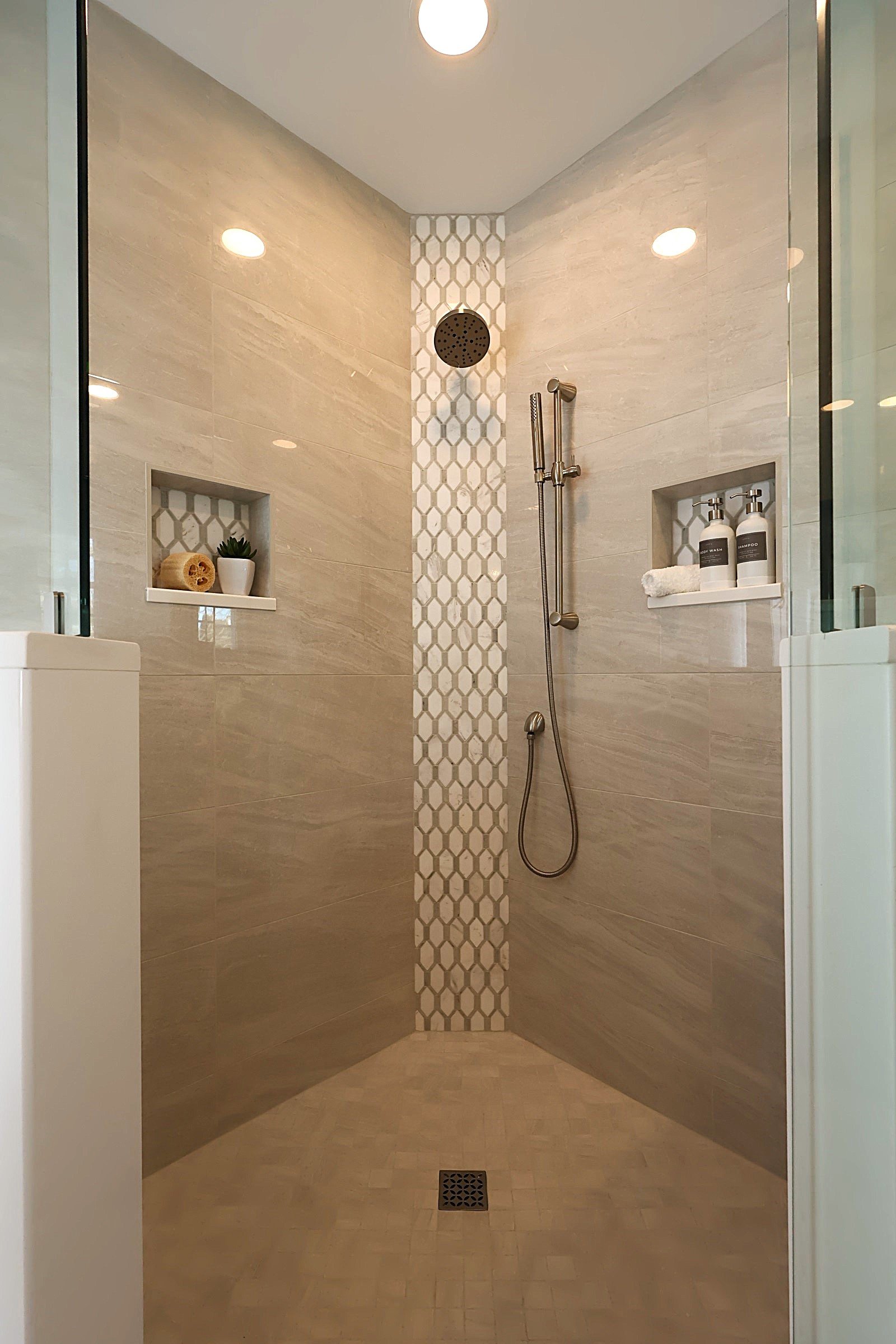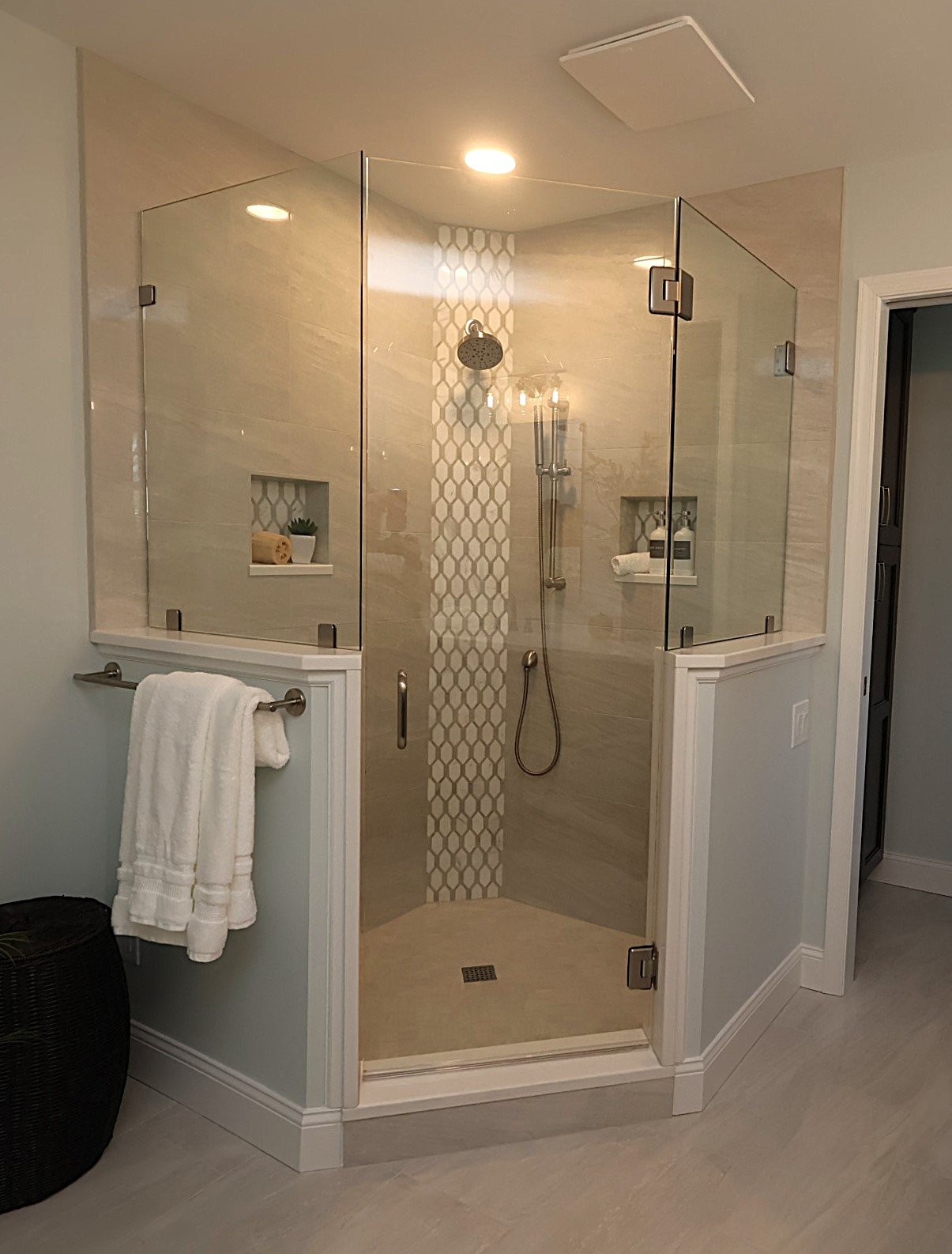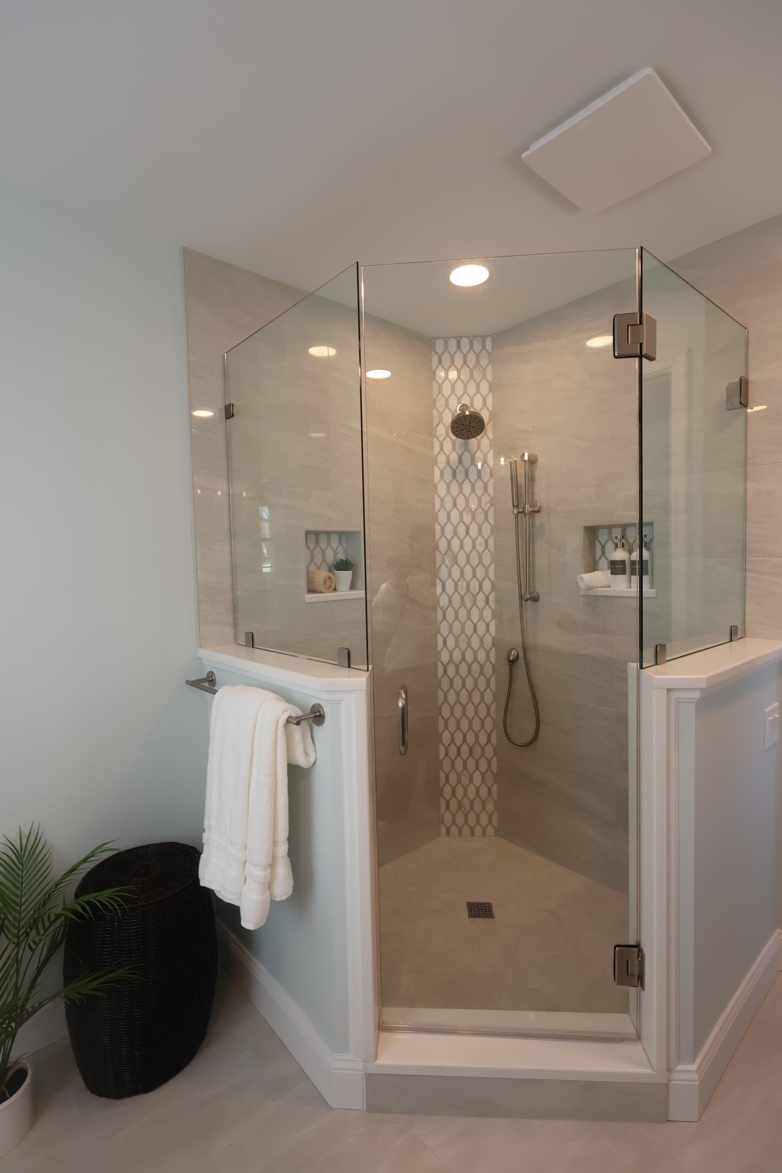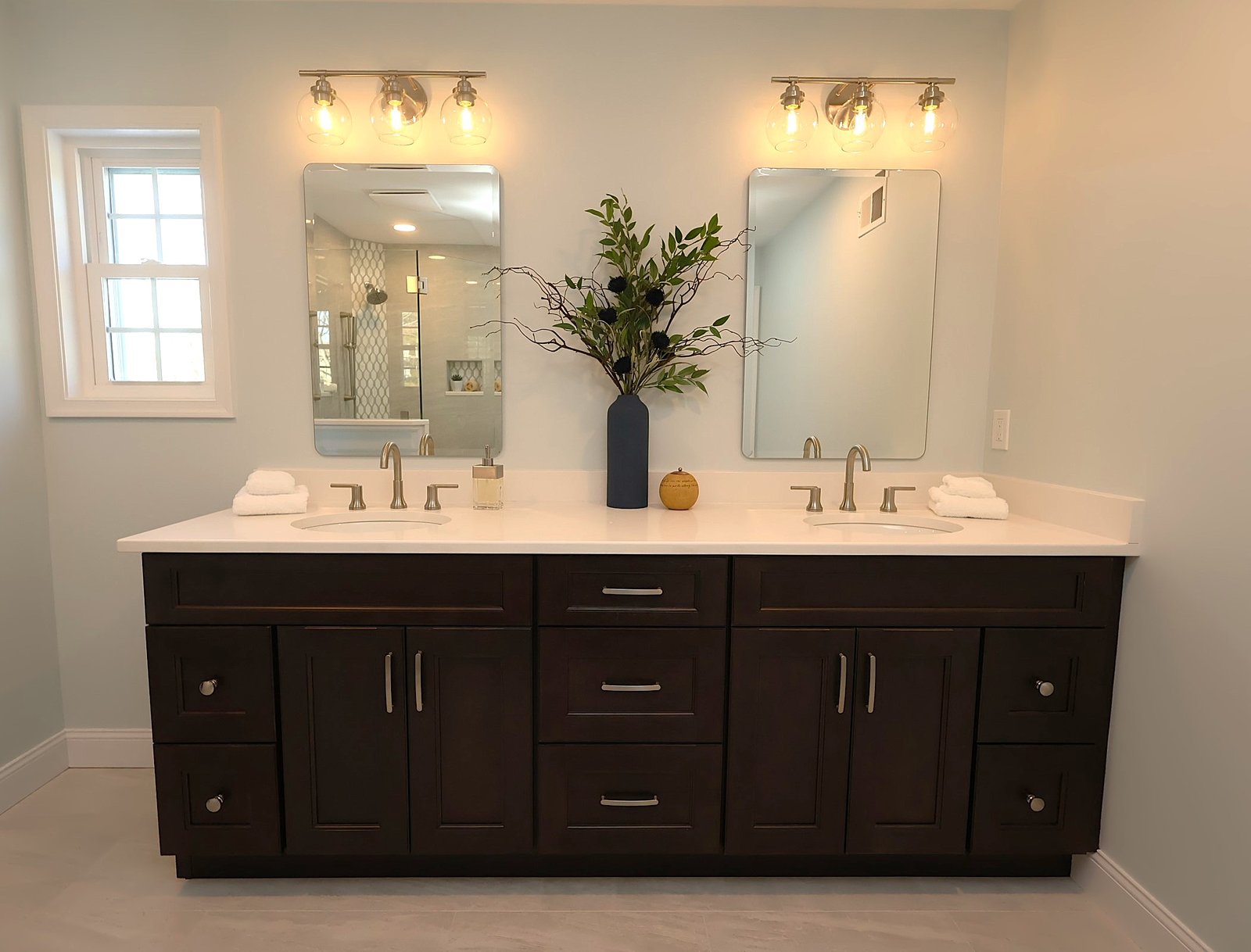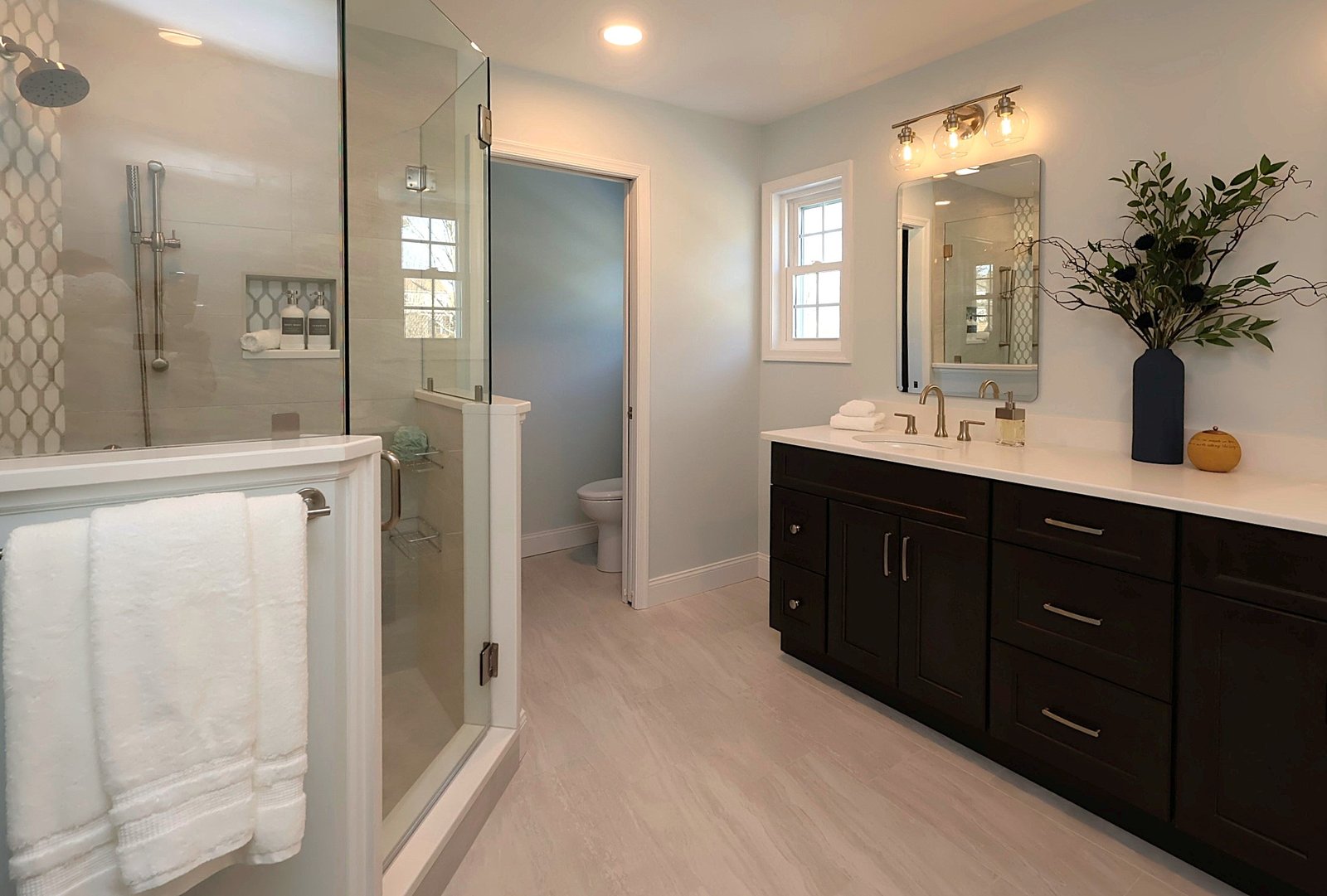 This Chester County, PA bathroom transformation embraces a contemporary yet inviting feel. The custom dark-stained double vanity features clean lines, soft-close storage, and a bright quartz top for contrast. The frameless glass shower is accented with bold geometric tile inlay, creating a striking vertical feature while maintaining an airy, open look. Thoughtful lighting and a neutral palette tie the room together, making it a calm, functional retreat.